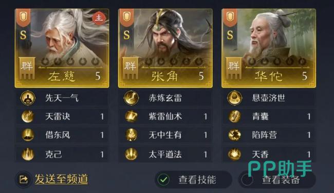 技能兵法搭配这一块,华佗优先带刮骨疗毒、资军后勤、天香等有治疗有减伤的技能,进一步扩大生存优势。左慈和张角可以带雷暴、借东风、太平道法、克己等主动输出技组合。