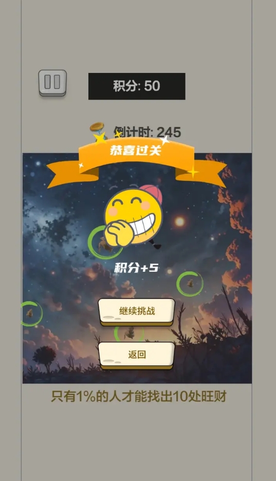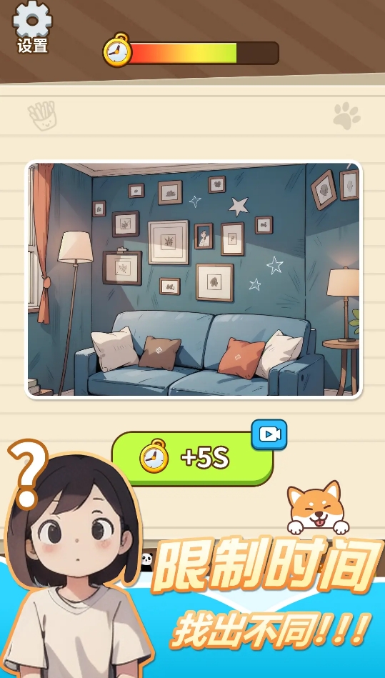这是一款典型的视觉搜索训练工具。关卡以写实风格场景图为载体,每幅图中均隐藏恰好十只名为“旺财”的犬类形象。玩家须在倒计时归零前完成全部定位,点击确认位置;误触无目标区域将直接扣除剩余时间。图像构图复杂、光影干扰强、旺财姿态多变且常与背景融合,对边缘识别、模式分辨及注意力分配提出明确要求。