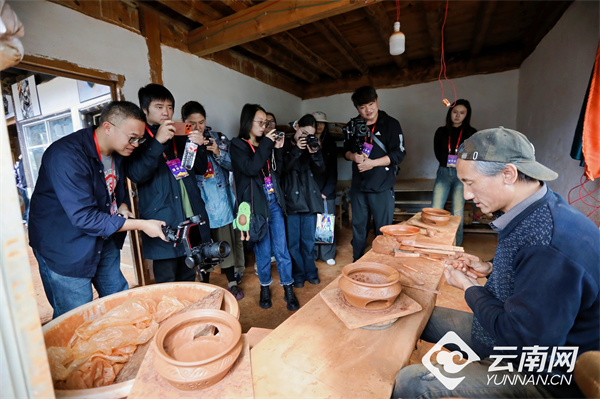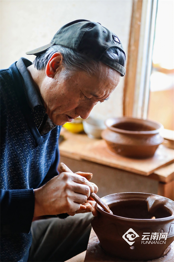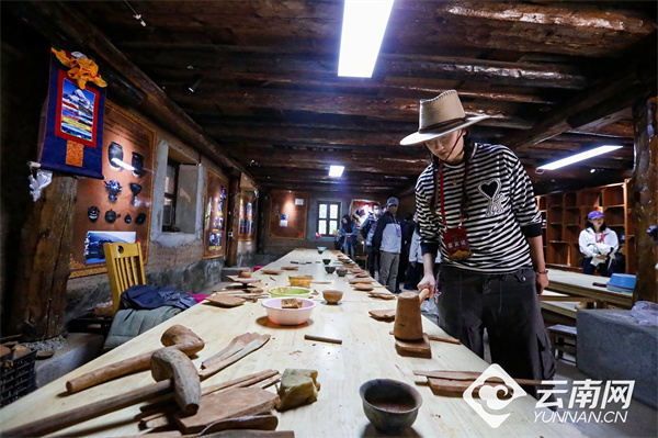在当珍批初的作坊里,浑厚而有节奏的拍打声不绝于耳。参加“世界的‘香格里拉’ 民族团结的家园”网络主题传播活动的媒体记者和网络达人围在一旁,静静欣赏当珍批初的匠心时刻。“我们尼西黑陶全用手工制作,和机器生产线不一样。”当珍批初一边拍打泥坯一边介绍,尼西黑陶要经过选土、晒土、舂土、筛土、和土、制坯、装饰、阴干、烧陶、渗碳、打磨等多道工序,制作出的黑陶富含氧化硅、氧化铝等成分。