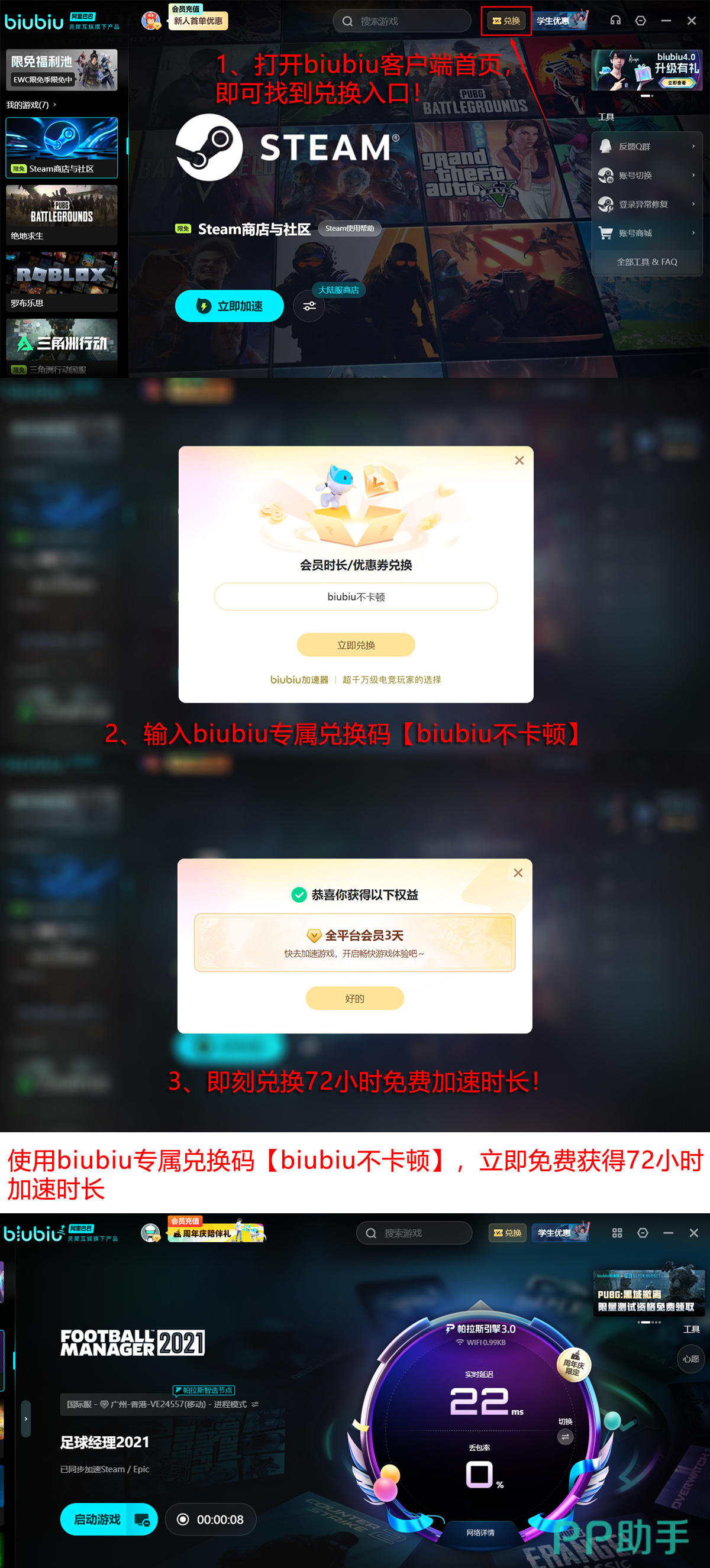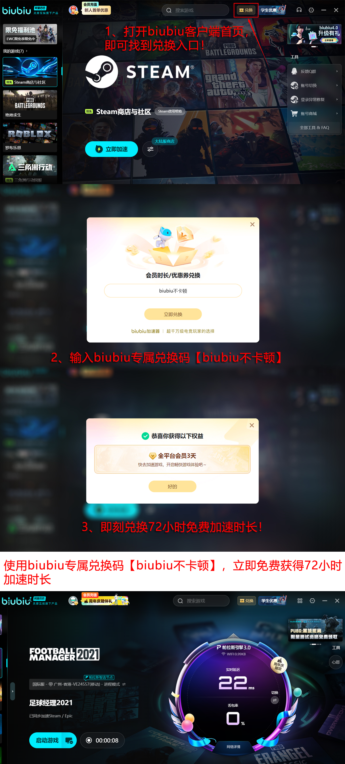 为帮助用户评估实际效果,biubiu提供面向新注册用户的24小时全功能免费试用权限,可完整体验加速服务在FM2021中的表现。所有用户(含老用户)输入兑换码【biubiu不卡顿】,还可额外获得连续三日的加速服务使用权,适用于密集赛程期或关键杯赛阶段,确保每一回合决策稳定输出。