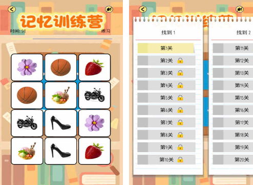 专业级认知能力训练工具型单机应用,提供“练习模式”与“挑战模式”双路径。题库涵盖食物、交通工具、体育器材等百余类现实物品图像,通过翻牌配对机制锻炼短期记忆与空间定位能力。所有图像资源与进度数据均预置在安装包内,不调用外部图床或云同步服务。