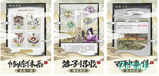 本作聚焦宗门建设维度,玩家担任初创宗主,需统筹山门规划、灵田布局、弟子分工与资源调配。弟子系统深度突出:根骨、悟性、心性三维属性影响其适配方向——可委派采药、炼器、巡山或外出历练。社交生态成熟,支持跨宗结盟、物资互通、联合试炼等多元交互,大幅增强世界真实感与长期可玩性。