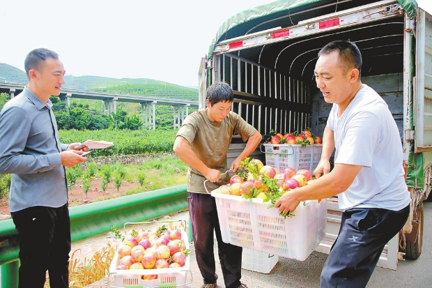 傍晚时分,盐水河畔的石榴产业大道上人群熙熙攘攘,小货车、三轮车排列成行,路边的圆通、中通、韵达等快递寄送点忙着出单、包装。贺启锐一家也加入了发货的队列,把包装好的石榴装车后仔细核对订单。货车发动时,贺启锐还不忘叮嘱快递点的工作人员:“师傅明天记得早点来,我们家还有400多件石榴要发出去呢。”