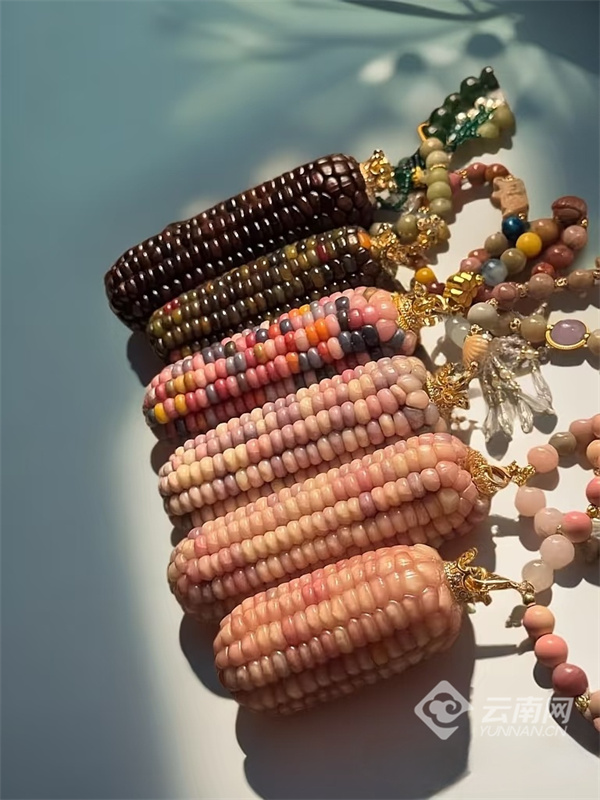 丰收的喜悦浸润在每一个劳动环节中。村民们手法娴熟地采摘着玉米棒,这些色彩斑斓的果实将被送入加工车间,经过晾晒、抛光等工序后,变身成为时尚手链、艺术挂画、盲盒礼包等文创产品,价值从最初的每包10元跃升至百元以上。正在地里掰玉米的当地村民张桂琴乐得合不拢嘴:“以前种普通玉米只够温饱,现在每天采玉米就能赚100多元,以后还能学手工制作技术!”