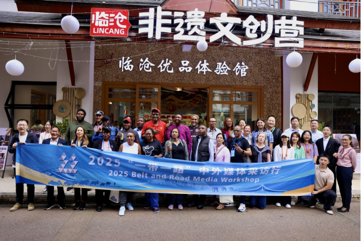 图为:9月18日下午,2025“一带一路”媒体合作论坛中外媒体联合采访团走进云南省临沧市,采访团在参加“临沧坚果”故事会主题沙龙后合影留念。