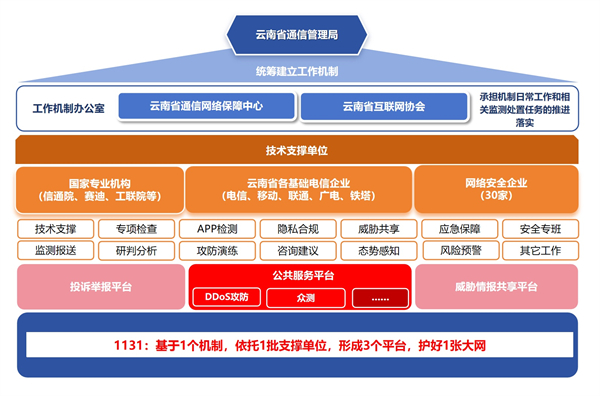 “1131”的第一个“1”即云南省公共互联网网络和数据安全威胁监测处置工作机制,由云南省通信管理局根据《中华人民共和国网络安全法》《中华人民共和国数据安全法》等有关法律法规及《通信网络安全防护管理办法》《公共互联网网络安全威胁监测与处置办法》《工业和信息化领域数据安全管理办法(试行)》等工作要求统筹建立,首批机制成员单位由云南省通信网络保障中心、云南省各基础电信企业、云南省互联网协会及遴选的技术支撑单位组成。