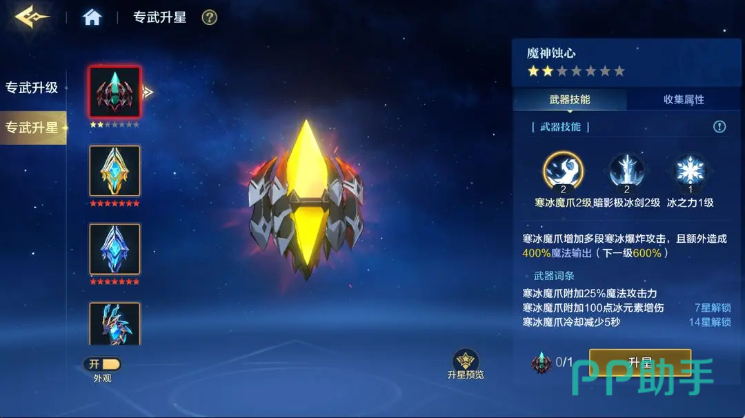 其次就是专武升星,消耗相同专武可进行升星,目前最高能升级到14星,升星对技能伤害有加成,同时会触发各职业属性攻击;专武升星同时能解锁武器词条,各职业专武带来的武器词条各不相同,红色专武和首个开放的专武技能重复出现。