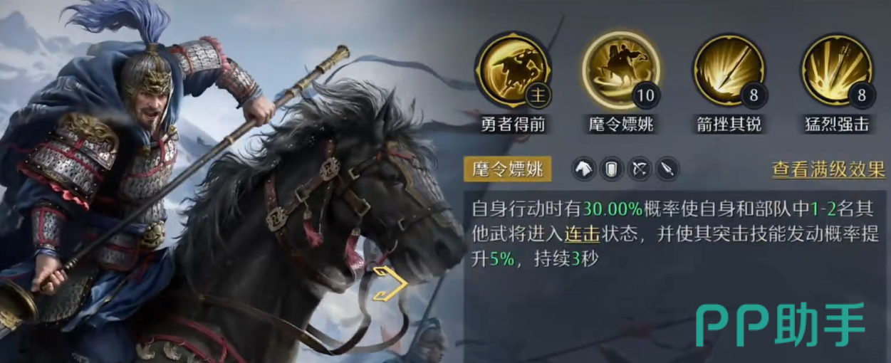 阵容战术支点在于张辽的机制重构:其被动效果现可使周围1至2名友军获得连击状态,基础触发概率为30%;通过常规进阶可提升至35%,后续强化还可再叠加10%概率,最终上限达45%。需注意的是,该加成仅作用于连击类效果触发,并不覆盖突击技能的发动率,相关机制逻辑已在测试服中得到初步确认。