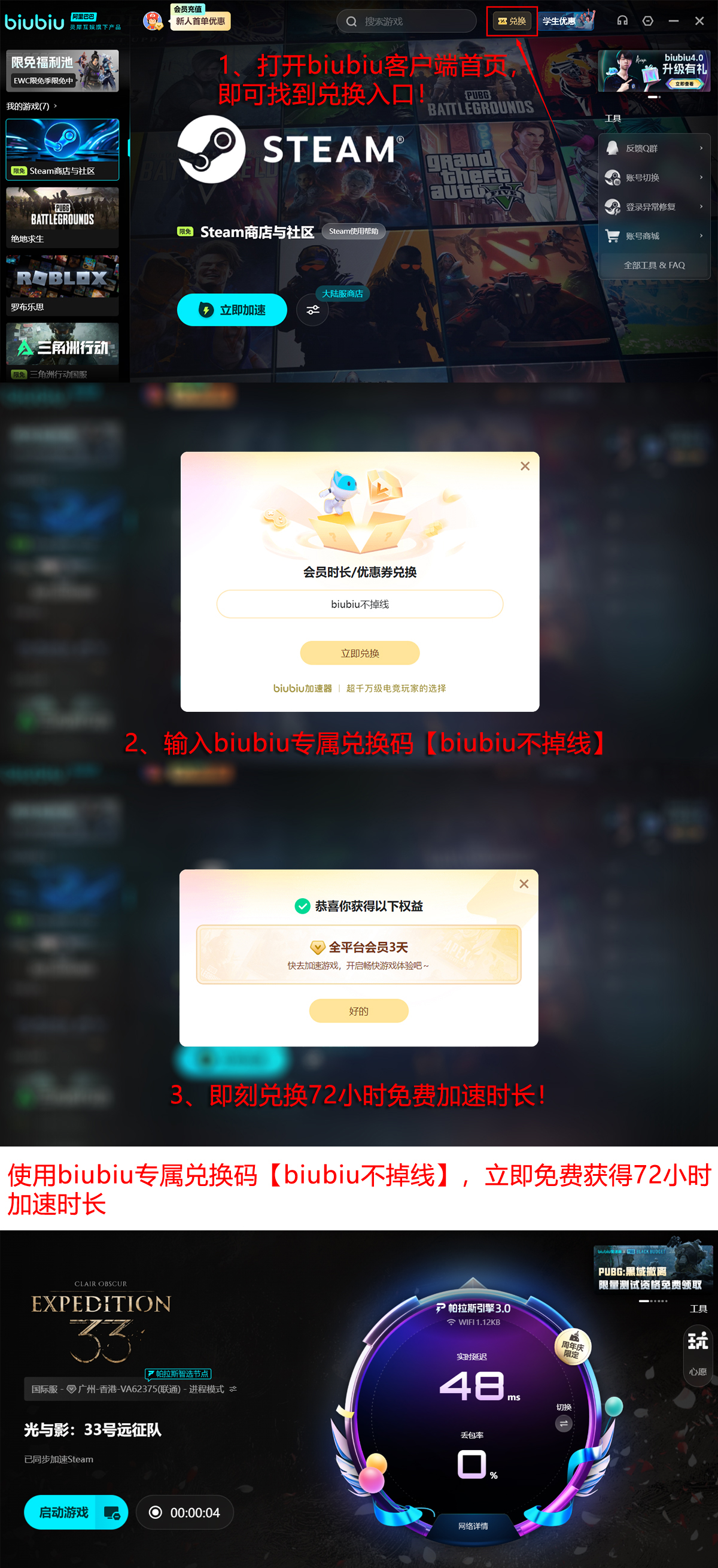 本次Steam冬促周期为12月18日至1月18日,biubiu同步推出专项支持计划:活动期间,Steam平台内热门折扣游戏将陆续纳入biubiu限免加速库,涵盖《光与影:33号远征队》等多款高热度作品,用户启用加速后即可享受全程免费加速服务。新用户注册后可立即获得24小时加速时长;若在激活过程中输入专属口令【biubiu不掉线】,还可额外获赠72小时权益,两项叠加总计96小时,足以覆盖完整下载、安装及初期游玩阶段。