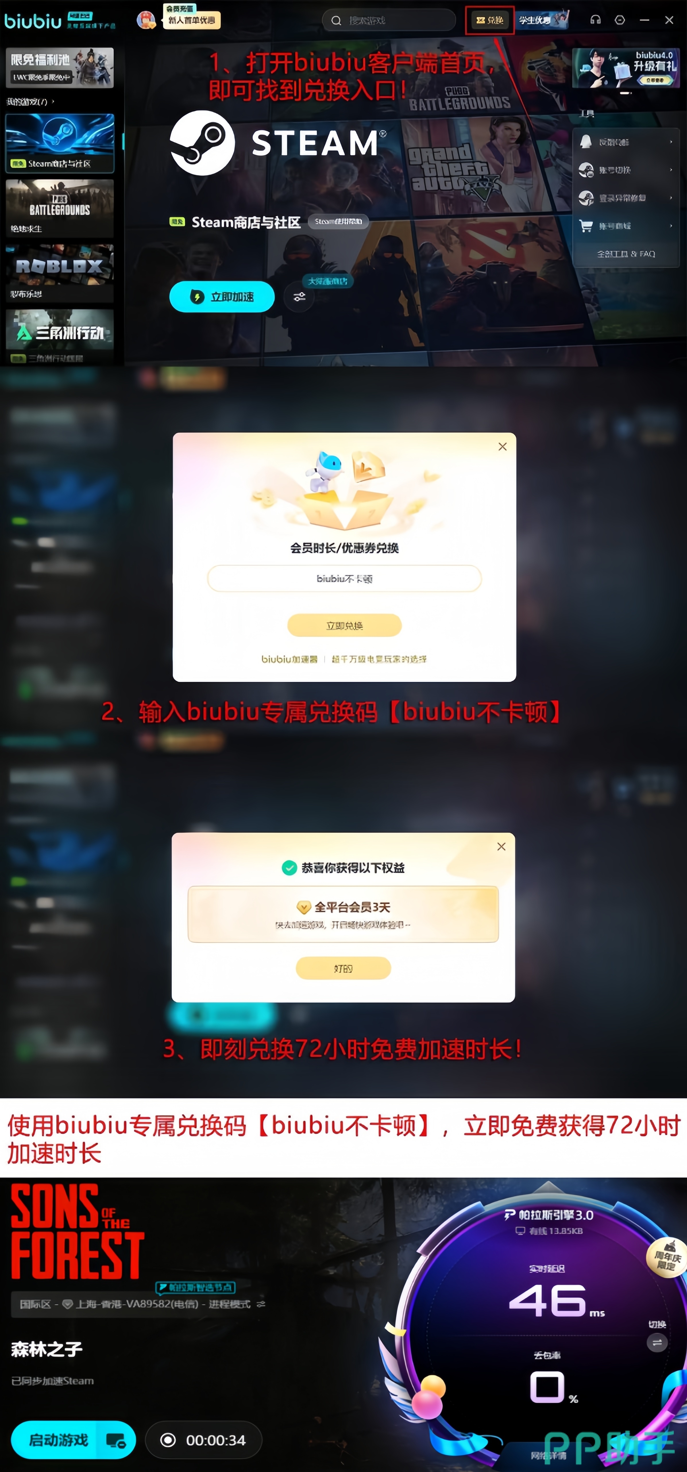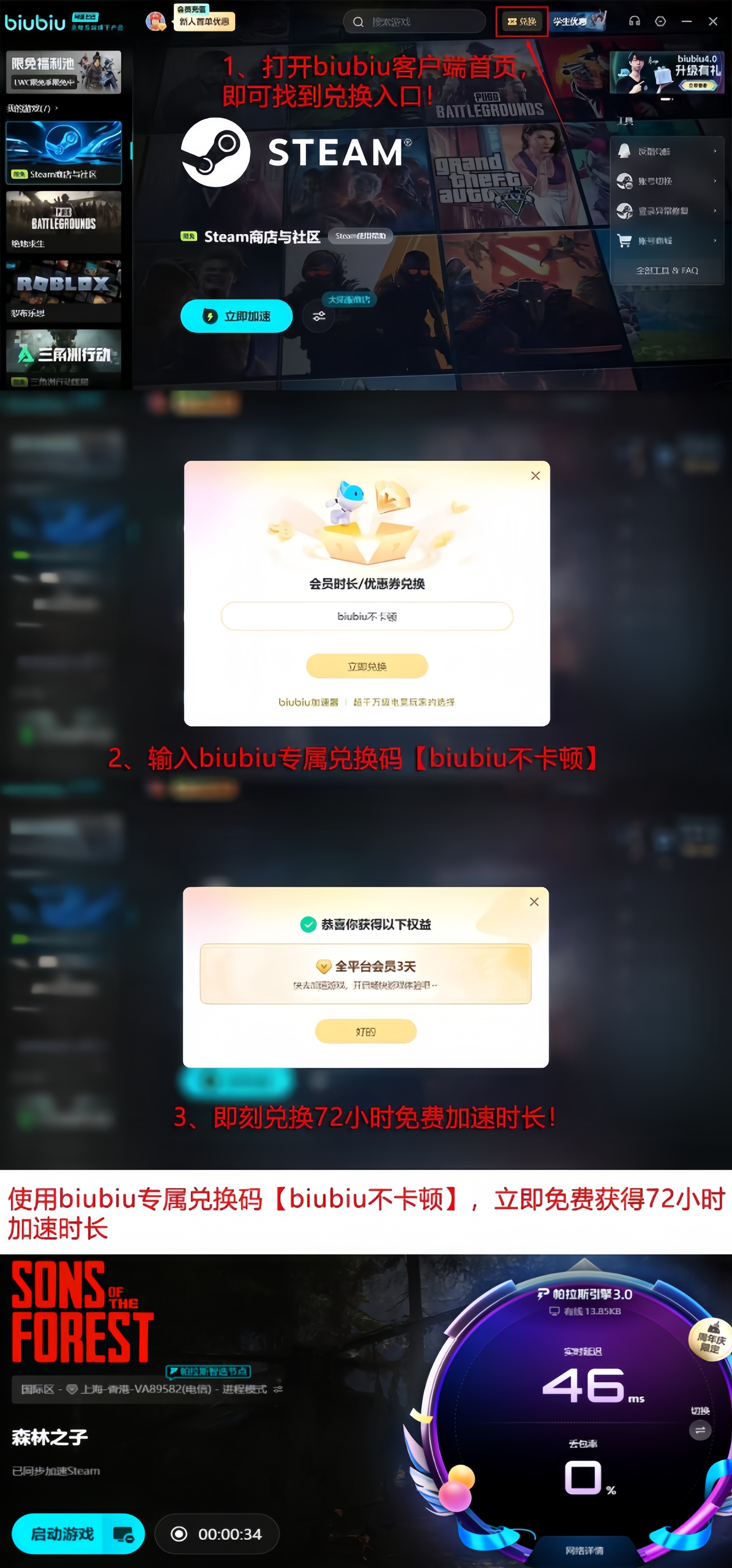 本次版本更新同步推出限时福利:新用户注册即赠24小时全游戏免费加速时长;所有用户(含老用户)输入兑换码【biubiu不卡顿】,可额外领取72小时加速权益。两项时长支持叠加使用,新用户最高可享96小时连续加速服务。建议玩家在组队前统一开启加速,避免因个体网络差异影响整体协作效率,从而提升多人合作建造、守夜防御及Boss战的成功率。