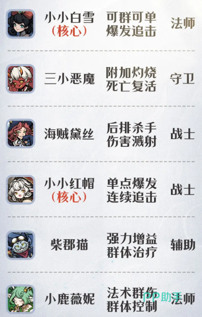 海贼黛丝作为战士却带有切后排能力,可以压低敌方关键输出的血线,为白雪锁定低血目标,同时自身的溅射伤害也能打出不俗的输出,小鹿薇妮除了有法术群伤还有群体控制效果,能辅助白雪输出,红帽有着极强的单点爆发,并且同样带有击杀追击能力,可以帮助补刀,三小恶魔作为守卫,带有死亡复活能力可以在前排抗下不少伤害,柴郡猫有着群体治疗的同时还能够为己方提供暴击加成等增益效果。