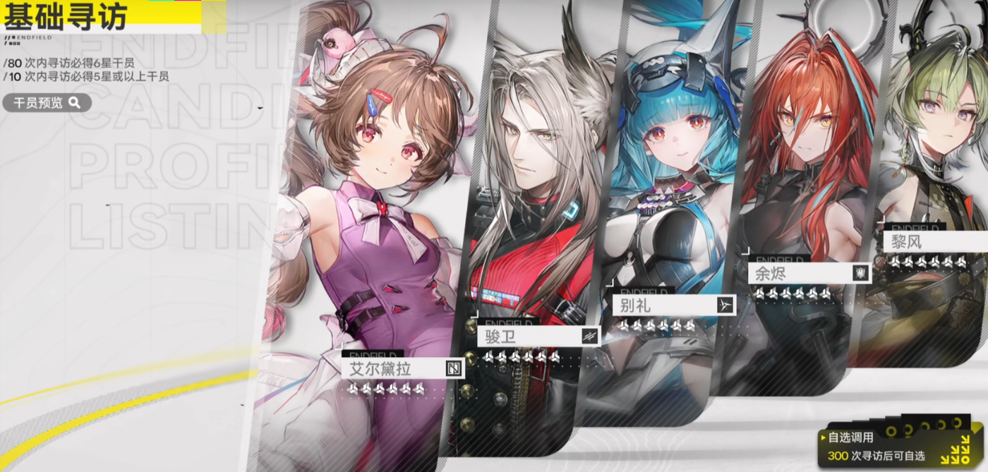 然后大家也可以自选一个六星干员,从五个角色里面选出一个。这里也要看个人需求,要是大家缺少奶妈辅助的话,就建议抽取艾尔黛拉啦,她的治疗能力特别出色,可以瞬间抬满队伍里面的血量,不过活动第三天就能获取,所以不建议抽!然后就是余烬,同样可以加奶加护盾,所以也没必要抽!接着就是骏卫,他的主要能力就是进行物理输出,能成为队伍中的核心,所以没有主C的朋友,就可以考虑抽取他啦!