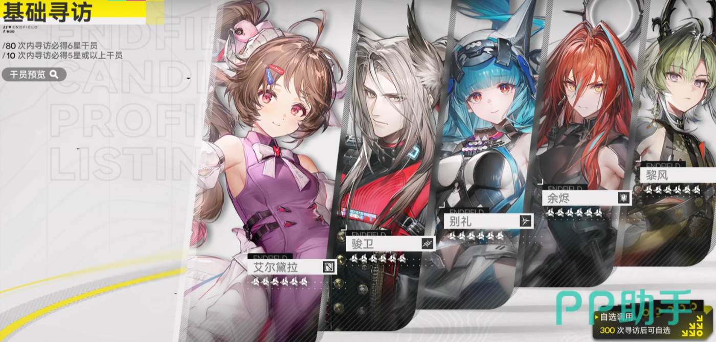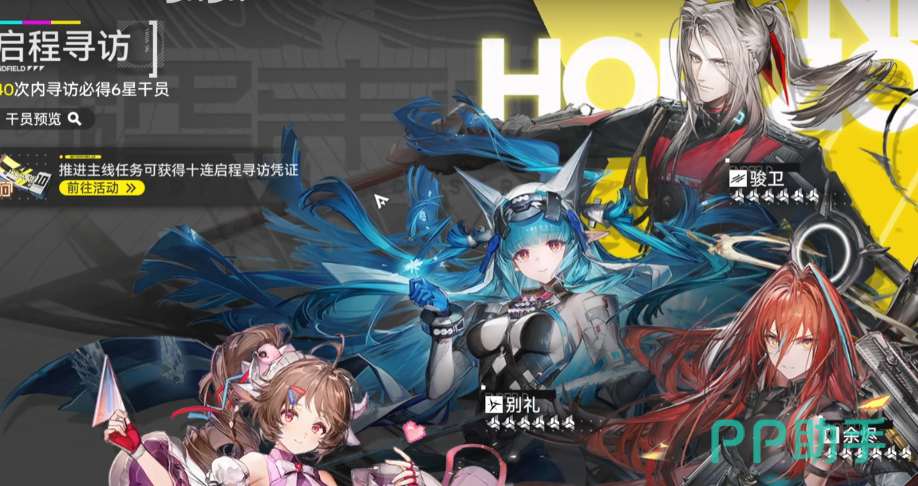 首先是最基础的新手卡池,对于萌新来说,刚进入之后即可去抽新手卡池,也就是启程寻访。在这可以用推进主线任务获得的启程寻访凭证去抽卡,所以大家只要做完前期的主线任务,那就可以保底获得40抽免费的寻访!这时只需要连续抽上十次,就可以保证自己百分百获得一个六星干员,以及其他若干的五星干员和资源道具,有利于前期发展!