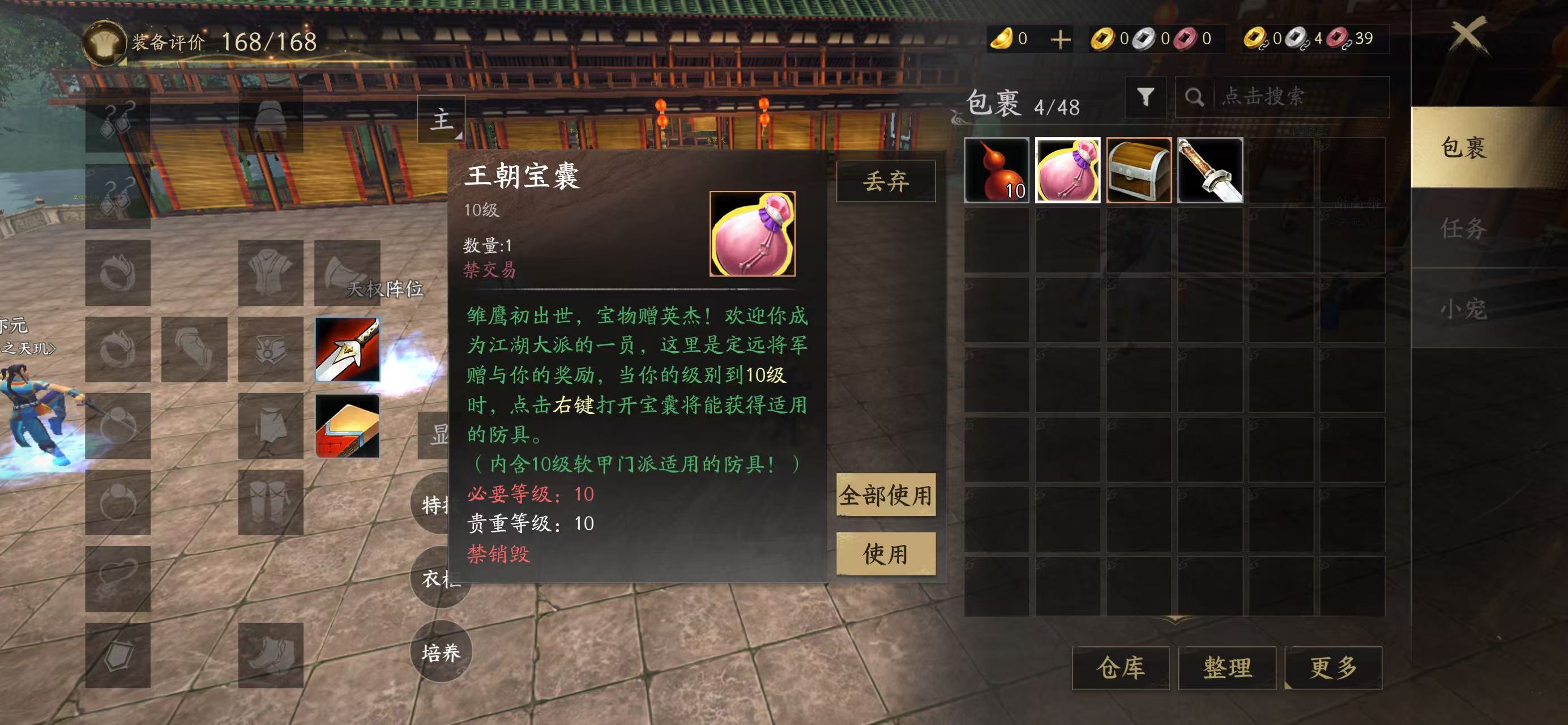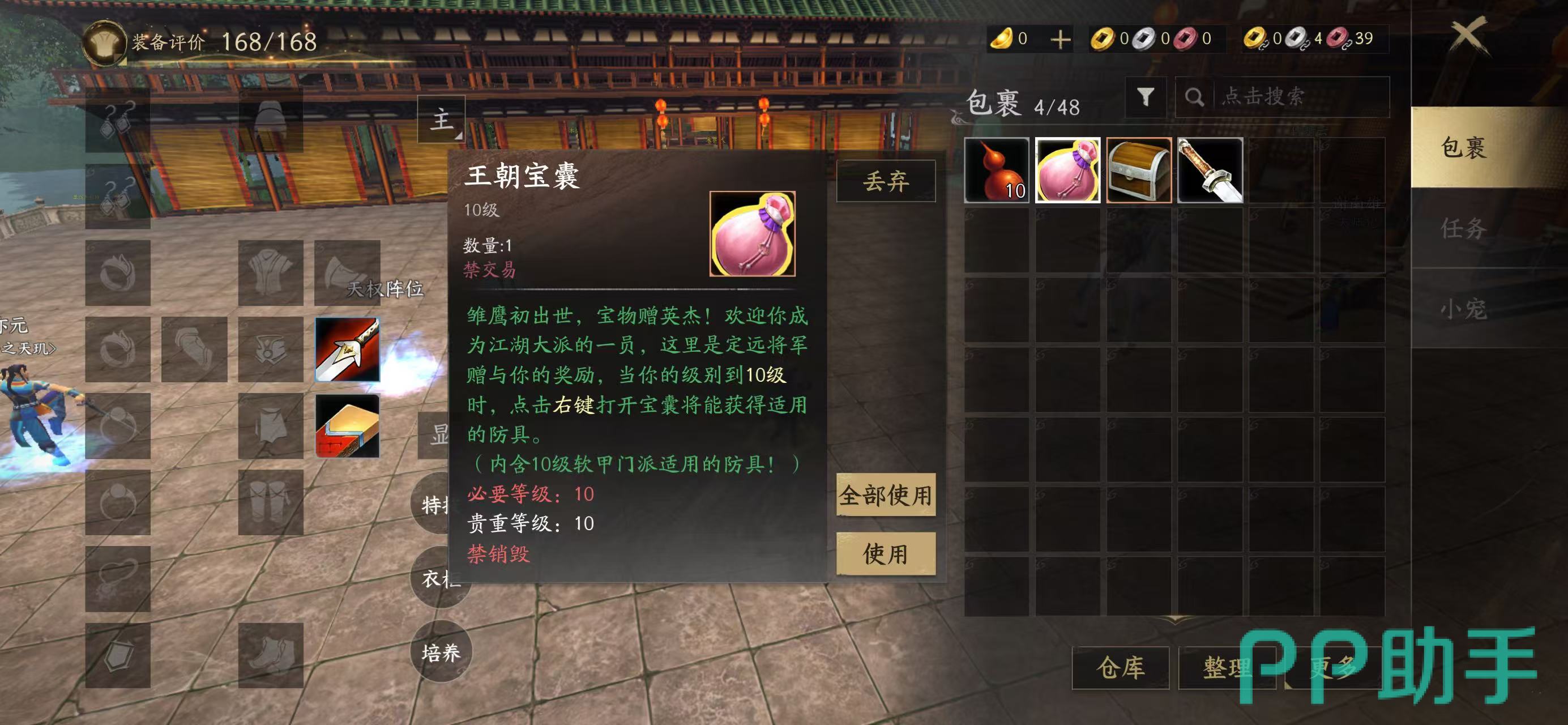 接着就会发现一个王朝包囊,这个道具要求玩家到达10级方可开启,要是等级不够高的话,建议大家先跟着主线任务去做。并完成一系列的战斗之后,自然可获得海量的经验值。若是赶时间的话,也可选择跳过当前的人物剧情!