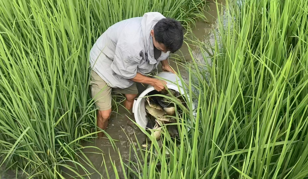 山泉水灌溉的稻田,水质清洁且富含有益矿物质,为稻渔共生提供了天然优势。如何将生态优势转化为经济价值?梁河县通过“服务在社、种养在户、全链保障”,让农民敢尝试、能受益。技术“托底”,制定种养标准化流程,优质软米稻苗栽插十天后,提高水位投放适量享受补贴的鱼虾苗种,利用流水带来的天然饵料养殖;水稻收割前排水捕获,或移入池塘暂养错峰上市。销售“拓路”,线下与益坤粮油等龙头企业合作加工销售,直供机关食堂、烟草客户,在景区景点设点展销,走进超市、农家乐,线上打造抖音账号直播种养技术、引流带货,依托“印盒山稻花鱼第一村”等农耕文化推广基地发展亲子捉鱼体验等乡村旅游,延伸拓展“一粒米”“一条鱼”的产业链和价值链。