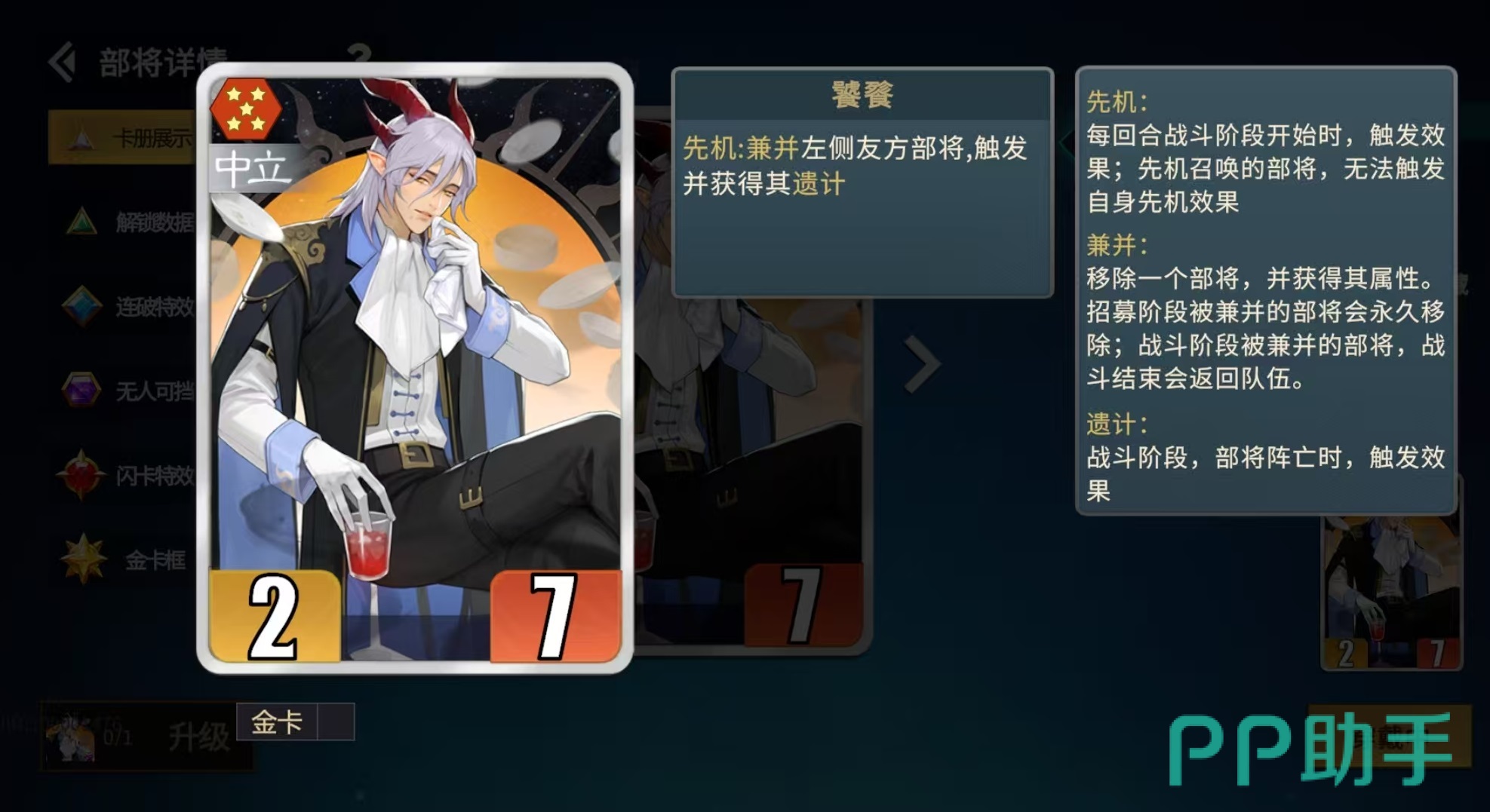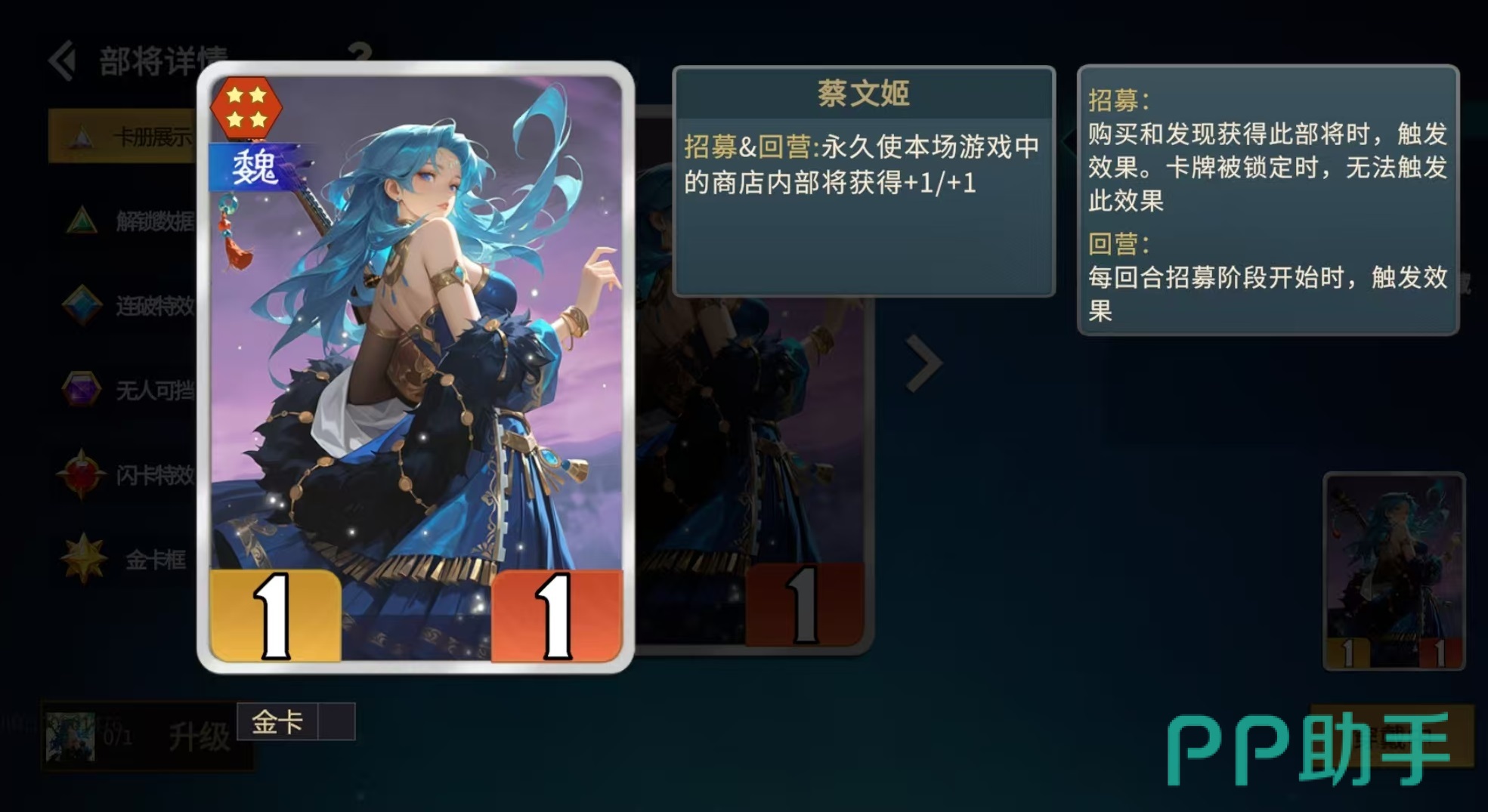 游戏最新的流派就是魏国兼并流,核心就在于通过武将卡的技能去抬商店武将的属性,然后再不断进行兼并进行养成。整套内容围绕着夏侯惇、许褚、司马懿和一些中立卡牌展开,需要做的是快速升本找到核心,后期依靠高额的属性数值直接碾压对手终结比赛。整套阵容有一些卡牌非常关键,首先是蔡文姬,这是整个流派的核心,它的效果是在招募时和回营时,都可以永久使本场游戏中的商店内部将获得加1/1效果,金卡为加2/2。只要有了蔡文姬,就可以快速将商店中的武将数值养成,这样兼并起来事半功倍。