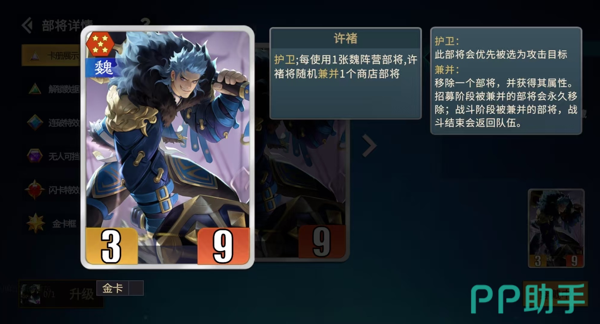 第二核心是许褚,许褚是整个魏阵营属性叠加最变态的一张卡,它具有护卫效果,每使用一张魏阵营武将,许褚都可以随机兼并一个商店部将。夏侯惇也是魏国的核心输出,他的技能效果是遗计,死亡时生效,随机对一个敌人造成同等攻击力伤害的法术伤害。也就是在临死的时候还可以再拉一张卡作为垫背,号称是魏国核弹。后续还有一些卡是司马懿、饕餮、玄武等,重点就是用饕餮、玄武去养成夏侯惇或者是许褚,司马懿继承buff补输出。整套阵容的核心选择是金饕餮、金夏侯惇、金许褚、金玄武、蔡文姬、司马懿等。