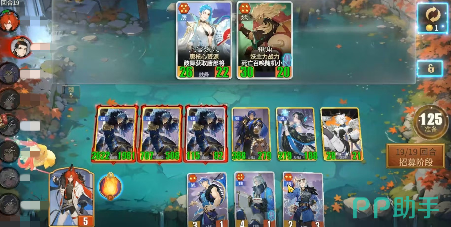 还有一套比较惊险的玩法就是在四回合升到四本,前四回合只升本,第五回合大约剩30血左右,然后再开始搜卡作战。这套玩法成型更快,但是更容易翻车,大家根据场上的情况,尤其是其他玩家选择的统帅技能再做出决定。如果其他玩家选择的都是一些前期强势的统帅,建议选择稳定的套路,如果大多数玩家都选择跳本就可以冒一下风险提前升本。前期选择过渡武将的时候,不用执着于魏阵营,其他阵营一些高战力高成长性的单卡都可以拿来使用。例如秦阵营的长城军,秦弩兵,或者是唐阵营的神策军等都可以过渡。统帅选择方面优先选能加商店属性的,例如曹操就是很好的选择,魏的出现也使得曹操的地位变强了很多。