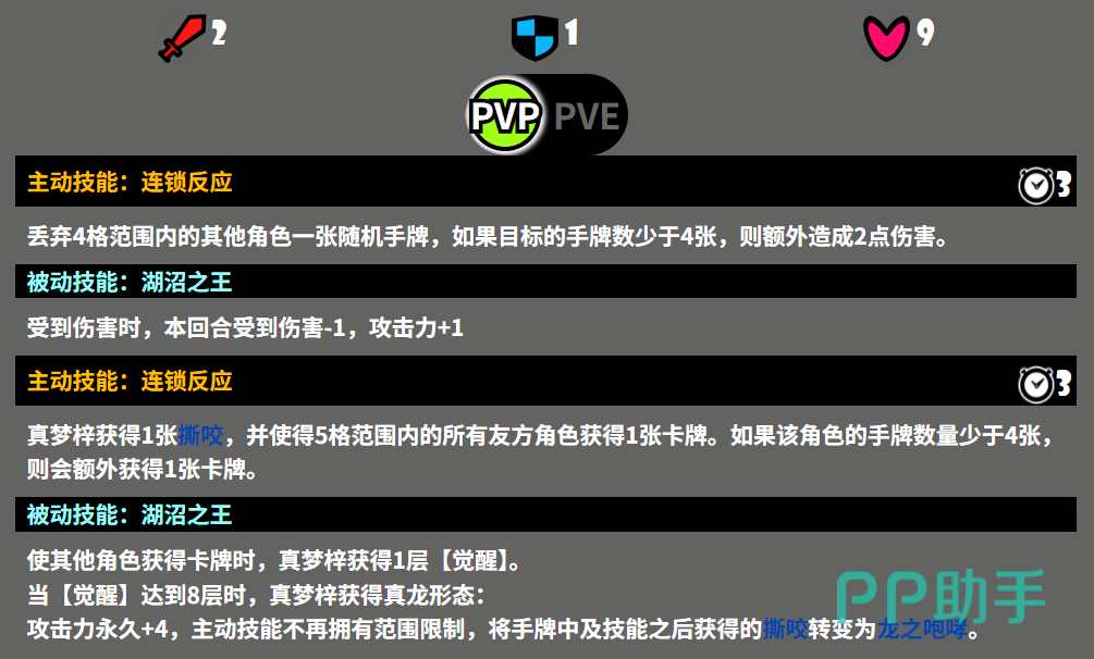 被动技能是自身受到伤害以后,接下来的所有攻击都会降低一点伤害,同时提高自身的一点力量,该技能可以提供不错的保护,让沼之蛟龙不容易一回合被秒掉。