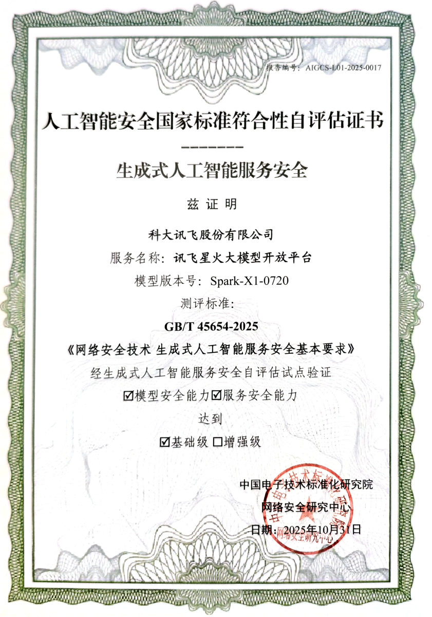 近日,科大讯飞星火大模型开放平台通过GB/T 45654-2025《网络安全技术 生成式人工智能服务安全基本要求》的国家标准试点验证,在模型安全能力和服务安全能力上达到该标准的基础级要求,成为首批获得《人工智能安全国家标准符合性自评估证书》的单位之一。