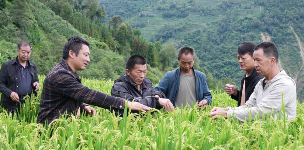 龙陵县农技人员到大水沟村查看旱地优质稻灌浆情况。通讯员 陈彩芬 摄