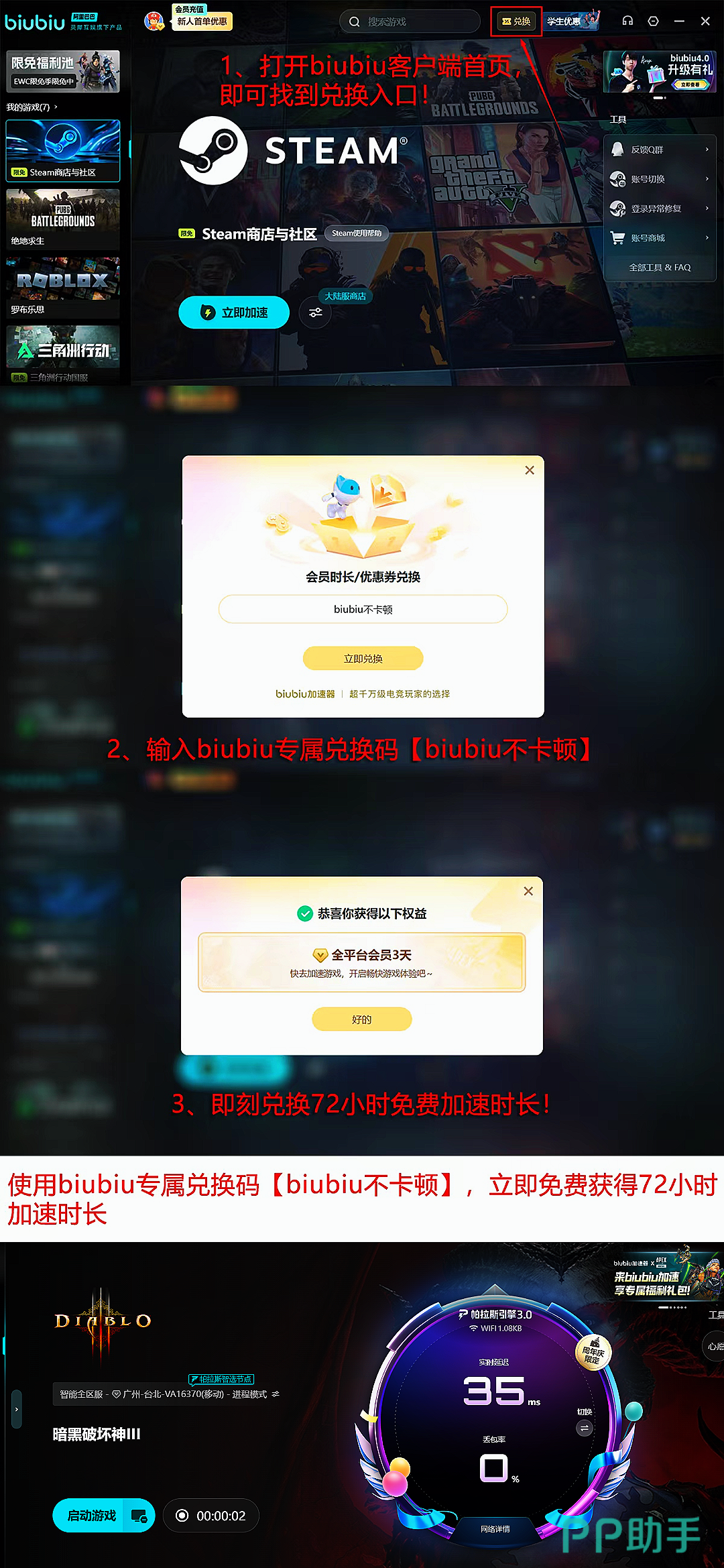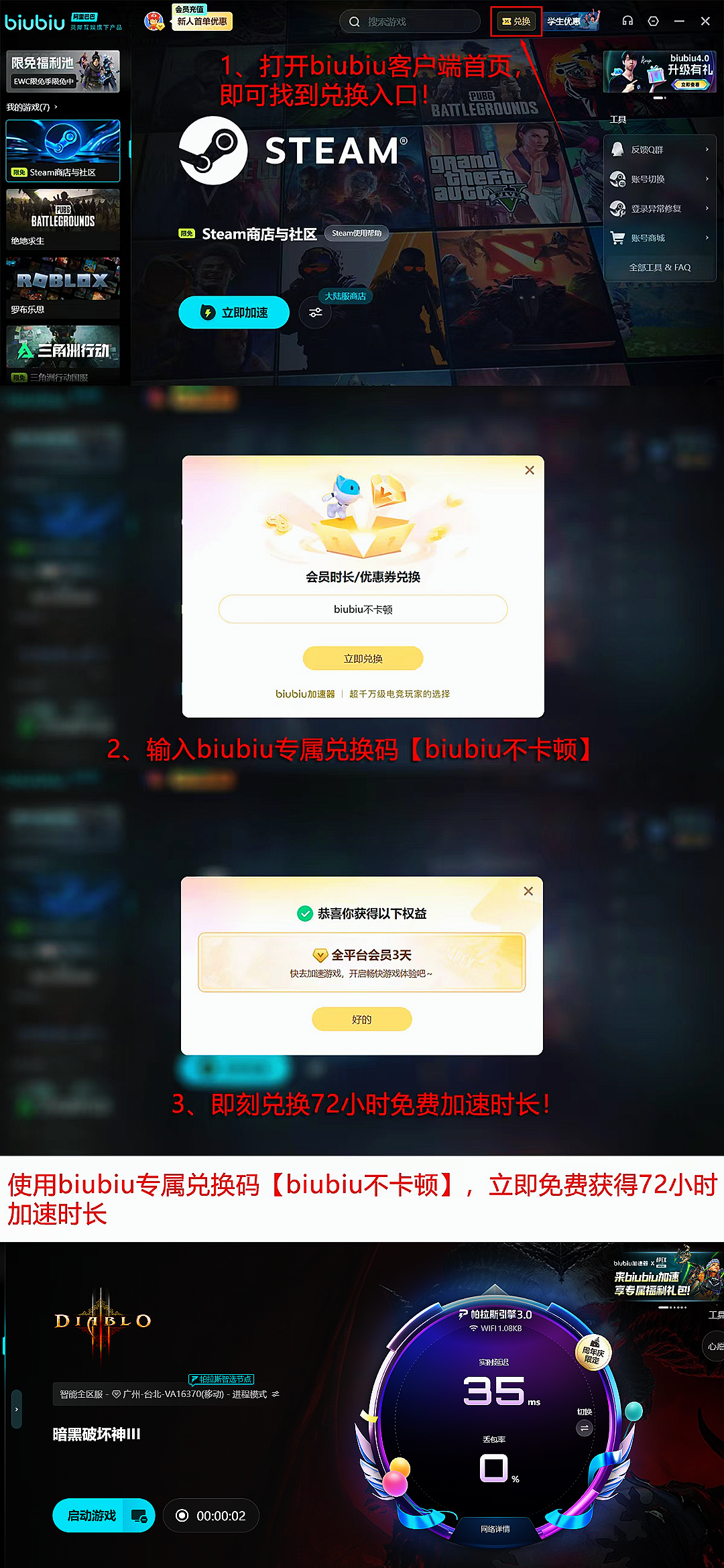 多数用户反馈,使用biubiu加速器后,《暗黑破坏神3》联机稳定性明显改善,整体满意度处于行业前列。平台支持全量主流及小众PC游戏加速,服务覆盖广泛。新注册用户可享24小时无门槛免费加速权益;所有用户输入兑换码【biubiu不卡顿】,即可额外获得3天高级功能使用权。