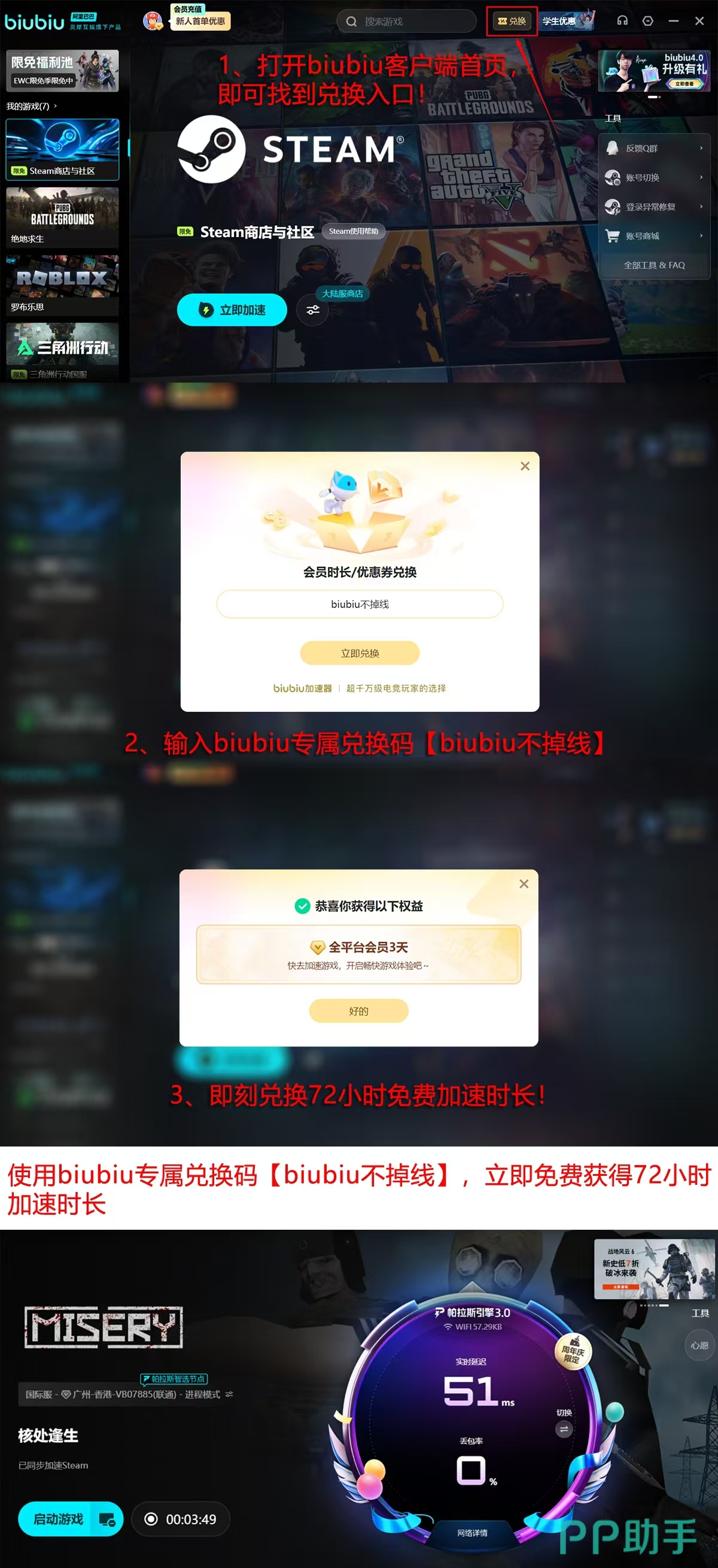 目前冬季促销活动开展(12月18日-次年1月18日),biubiu平台面向全量用户开放限免加速池,支持Misery核处逢生等热门游戏的即时搜索与一键加速功能。新注册用户可直接领取首日全功能试用24小时,叠加参与【biubiu不掉线】活动还可额外获得72小时高级加速权限,累计享有96小时无限制顶级加速服务。