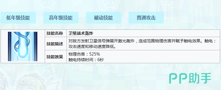 她的技能体系围绕两大核心构建:精准触电控制与高效范围压制。普攻虽形态简洁,却具备实战价值——基础状态下即可发射激光,造成小范围物理伤害;强化后更可概率触发“触电”效果,同步削弱目标移速与攻击力,为团队创造理想输出环境。一技能“卫星战术轰炸”是其控场标志技:造成525%范围物理伤害,并附带长达6秒的触电状态,瞬间瓦解敌方阵型完整性。