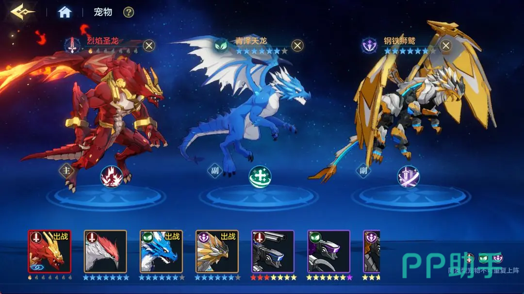 宠物有不同品级,目前有4种,蓝紫橙红,还被区分为不同的3种类型,分别是进攻型,辅助型,强化型,每种类型宠物只能携带1只,也就是说一共可以带3只宠物,进攻型宠物技能可造成伤害,辅助型主要技能效果就是回血,强化型宠物进行增伤。