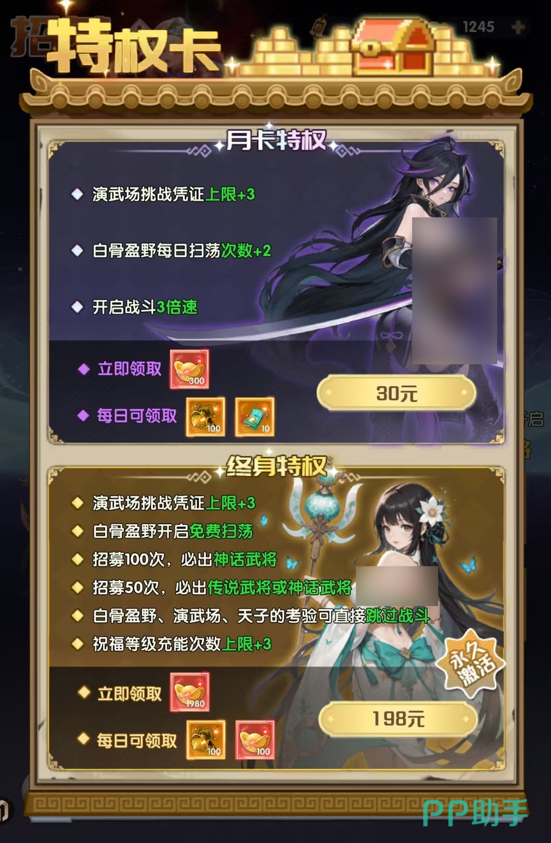 2、接下来就是特权卡了。特权卡分为了月卡和终身特权,售价分别是30元和198元,小编的建议是月卡足够了,特权卡获得的权益玩家只要有足够的耐心,刷下战力都是能解锁的,本身游戏的倍数战斗也是能慢慢升级的。