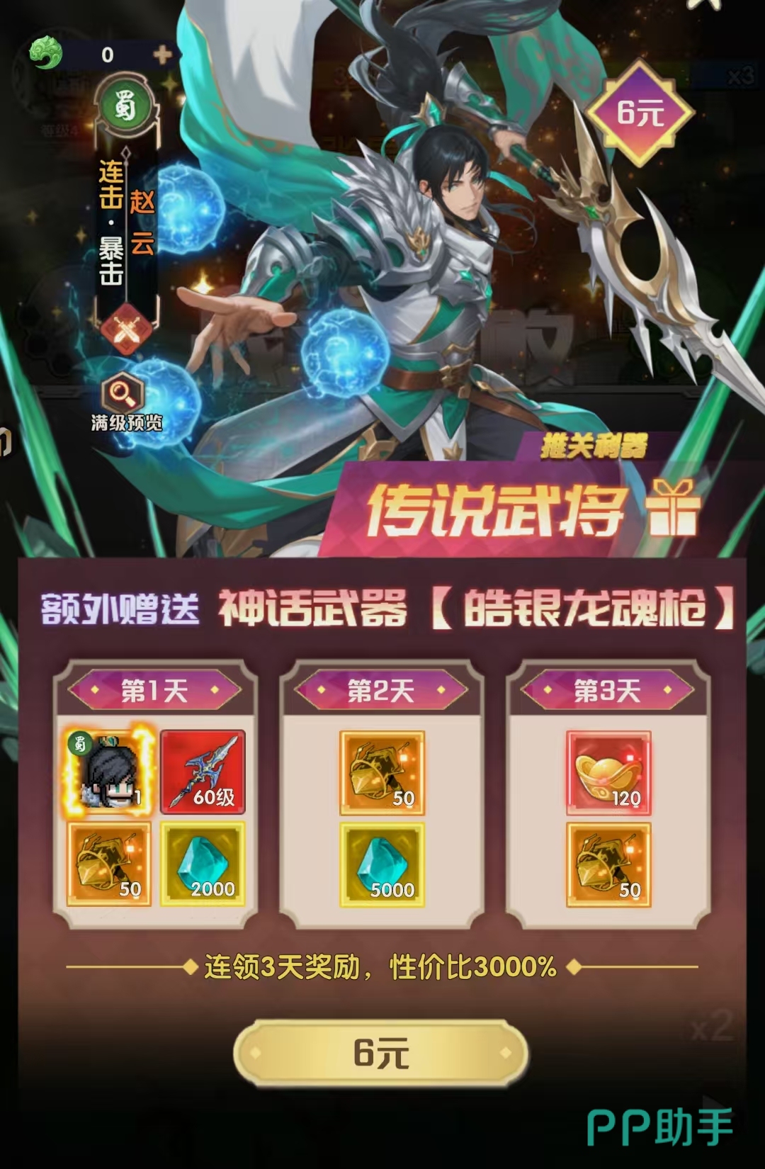 1、首充奖励可以说是对新手玩家最为友好的,首充赠送传说武将“赵云”,这是传说级别的武将,关键他是一个输出型角色,不管是在哪个阵容中都能担当主c的位置。一旦在前期解锁了赵云,再加上后续的武将养成,能让玩家轻松倍数过好几章。