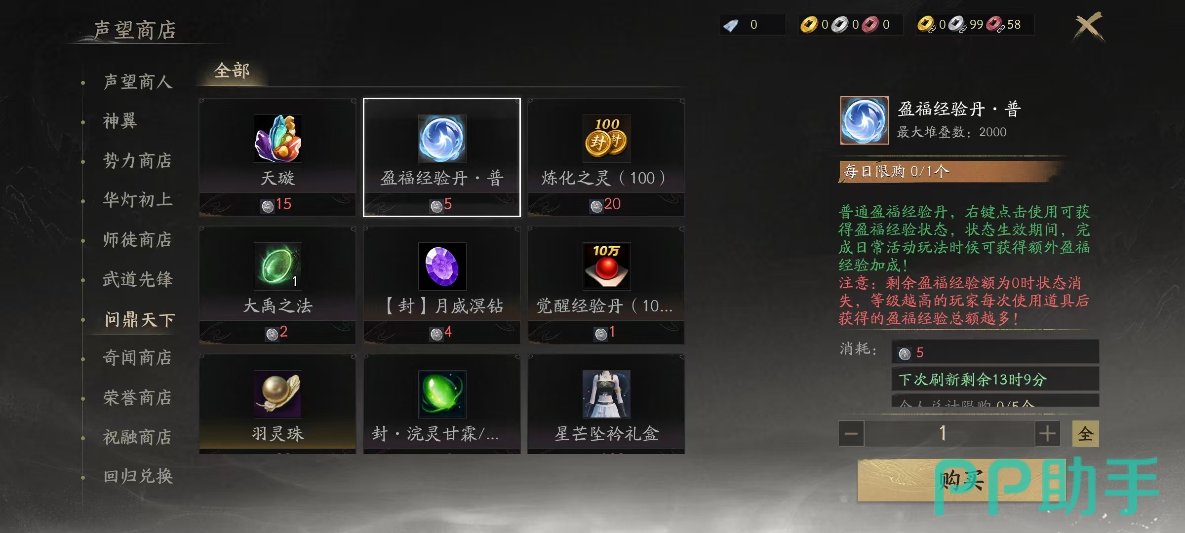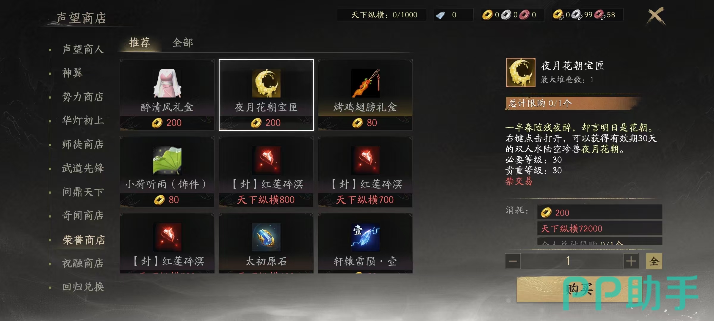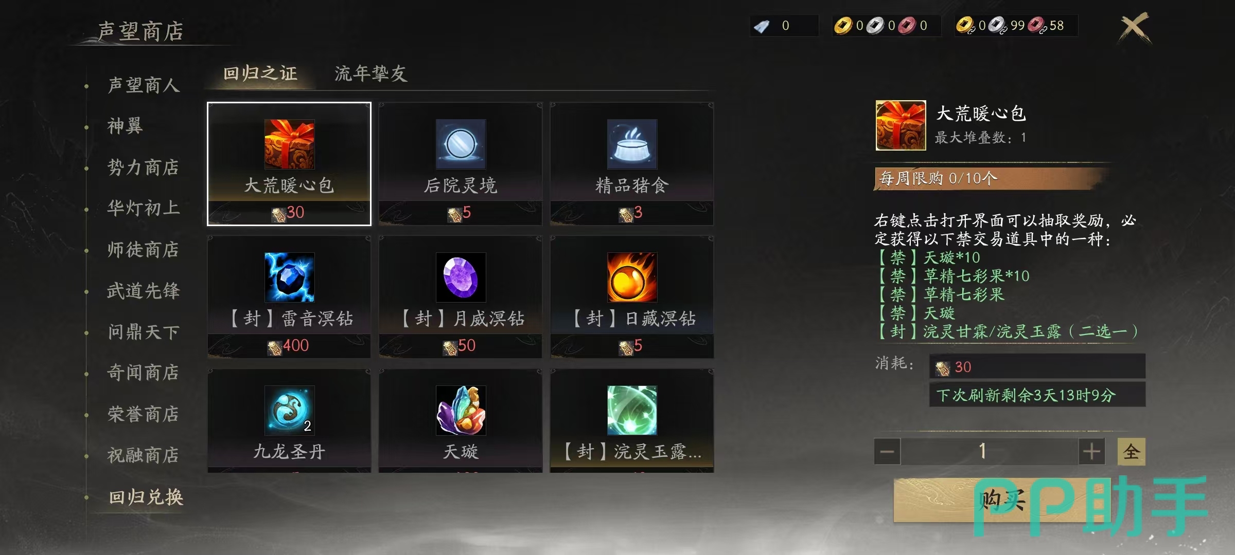 大荒钱庄声望主要通过饕餮讨伐战,有机会获得武库密钥,右键点击使用可获得声望,还有部分消费返还活动也有机会获得。王朝军资声望的获得是在道具商城购买国之恩典或是国之恩赐等,然后点击使用获得。用途广泛包括在商人处兑换物品,给过期外观续费等。天域声望可以通过向商人出售天域武器、天域奇珍等方式获得,通过提升门派套装会根据升级前的评分返还一定的王朝天域声望。