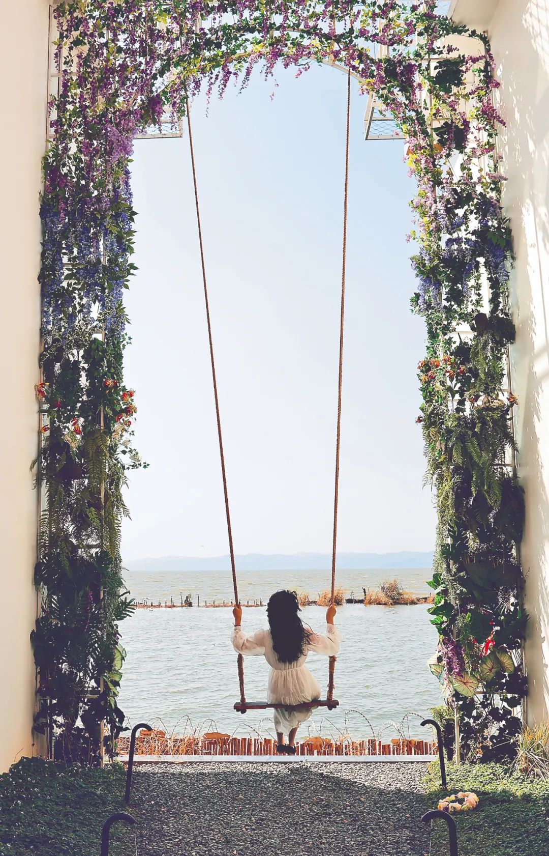 游客在滇池湖畔的民宿外荡秋千 高吴双 摄