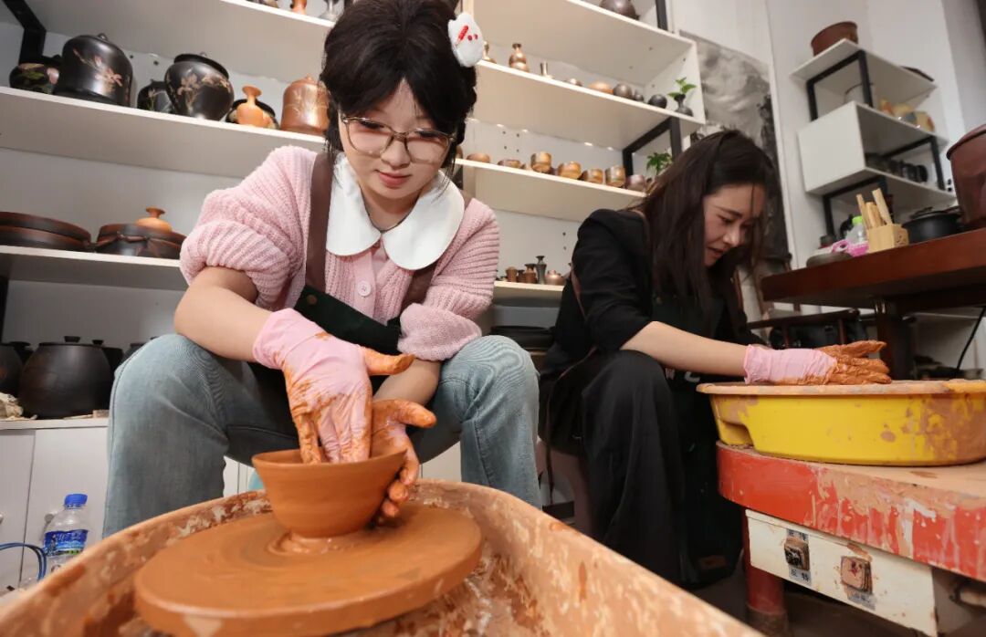 游客正在体验紫陶的拉坯制作过程。黄兴能 摄
