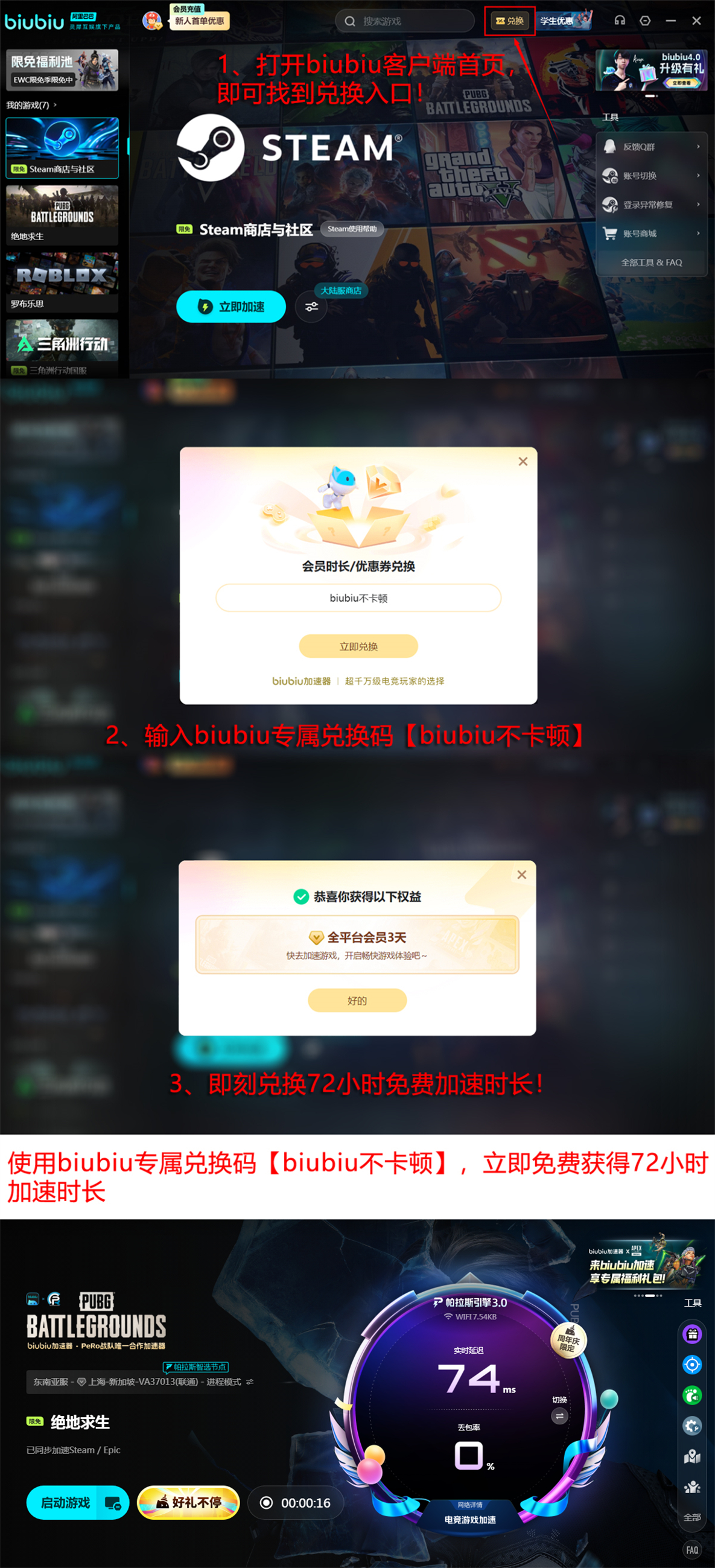 针对新用户,biubiu提供双重体验保障:注册即赠24小时全功能加速时长;另可凭兑换码【biubiu不卡顿】额外领取72小时加速权益。两项福利叠加后,总计可享96小时无限制加速服务,充分满足新手熟悉期与进阶训练阶段的网络需求。