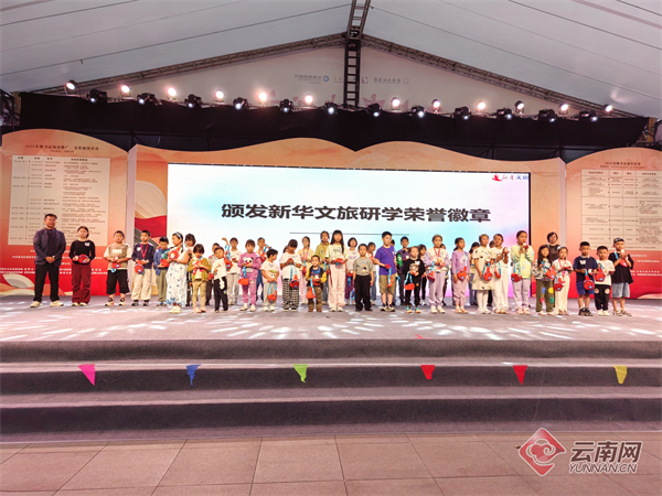 活动现场,云南新华文化旅游有限公司还为40余名特邀小嘉宾颁发了三色研学徽章。随后,云南新华文旅研学导师团队引领全场诵读《读书万卷 行路千里》,当童声伴着音乐响起,孩子们的心灵在文字的韵律中同频共振。