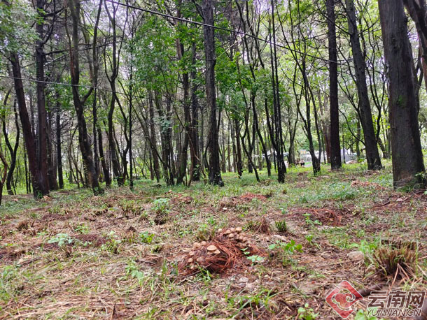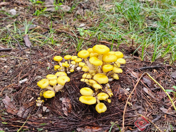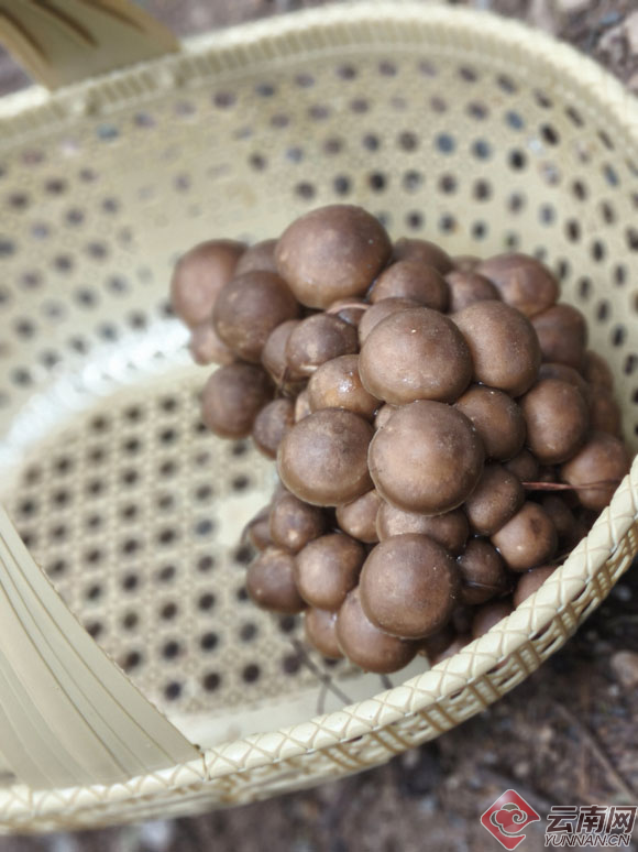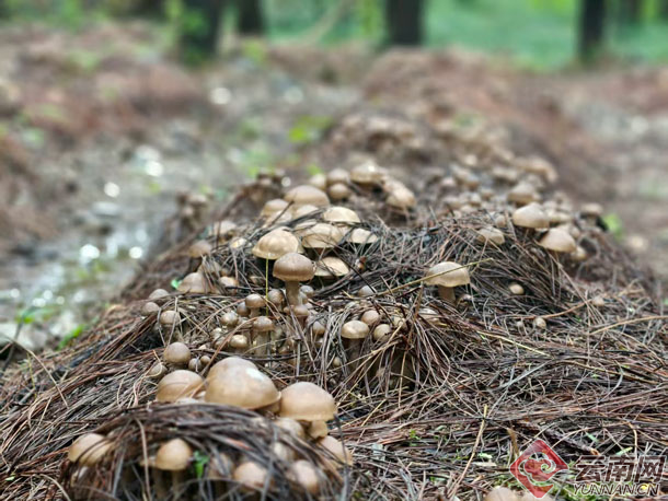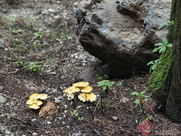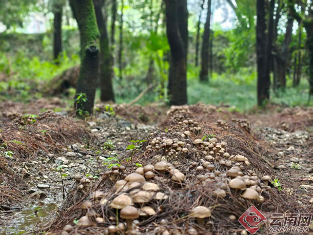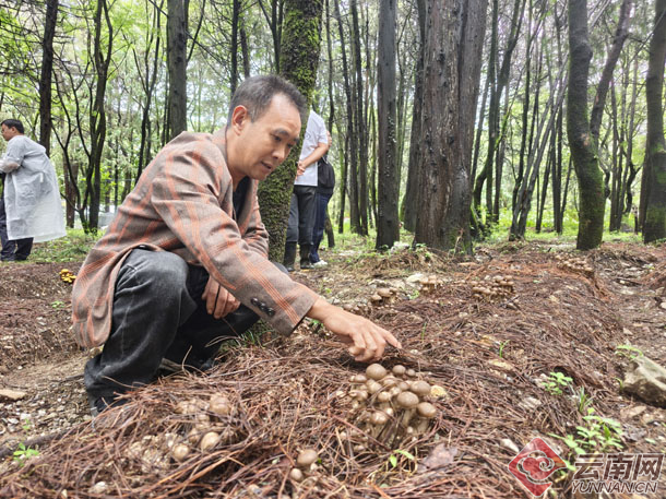 雨后的大理蝴蝶泉景区,山林间弥漫着清新的草木气息,穿梭林下,一窝窝藏在腐叶中的仿野生种植菌子正等待采摘。