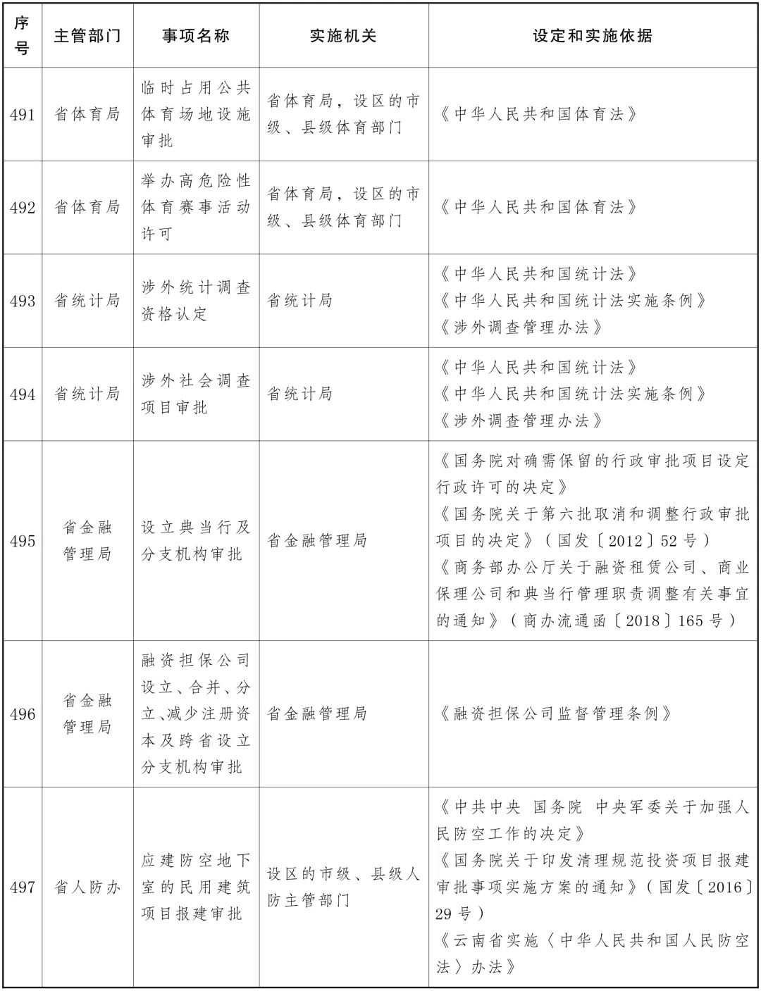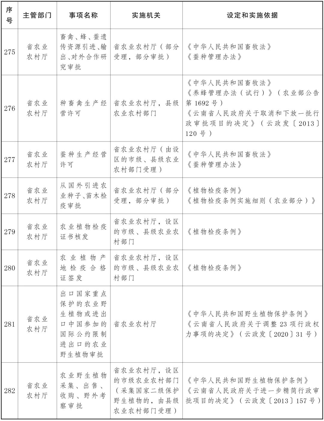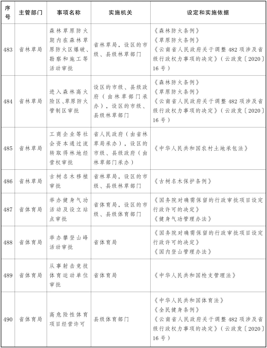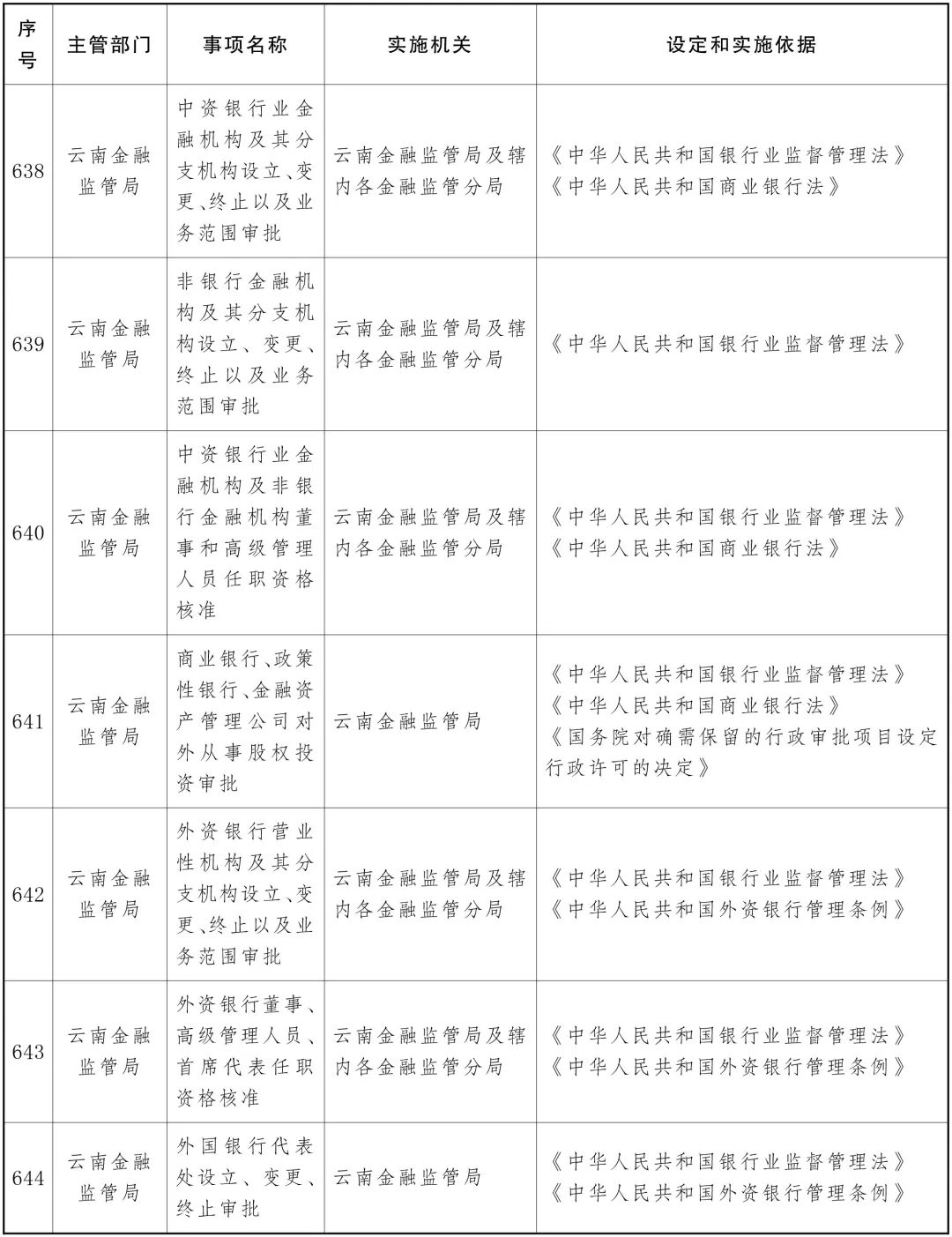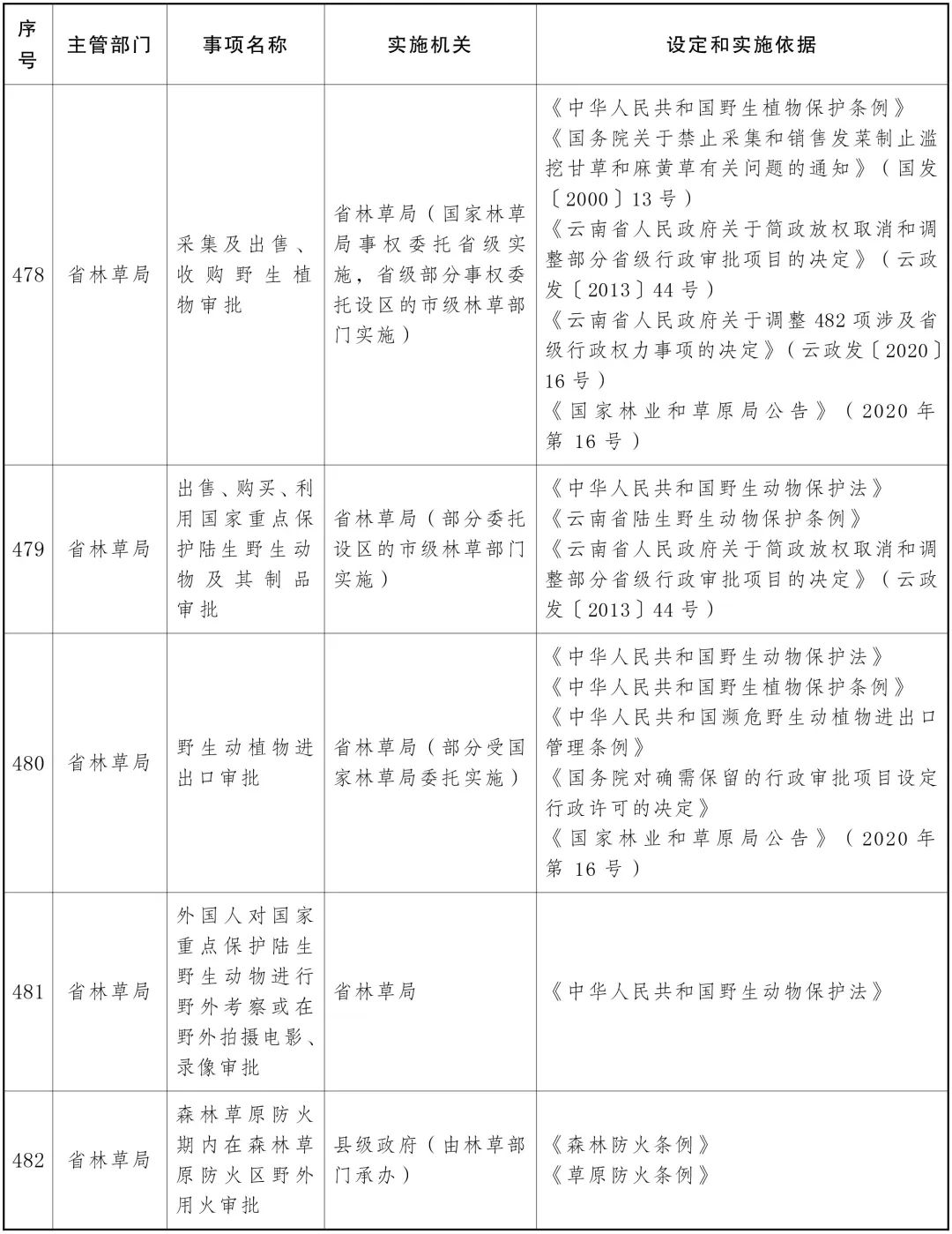 一、新增实施许可事项。新增“非银行支付机构许可”许可事项,主管部门为中国人民银行云南省分行;新增“古树名木移植审批”许可事项,主管部门为省林草局。