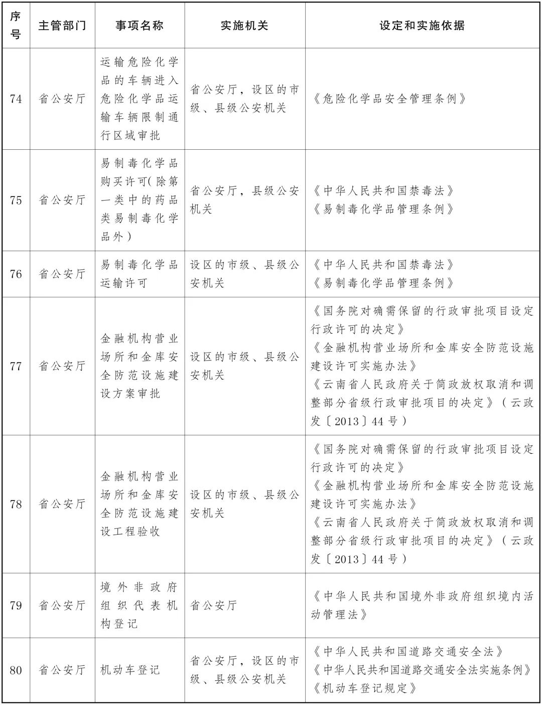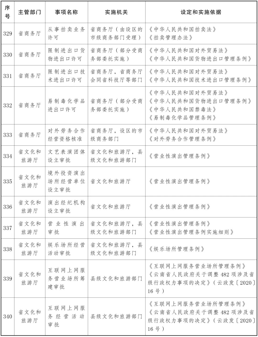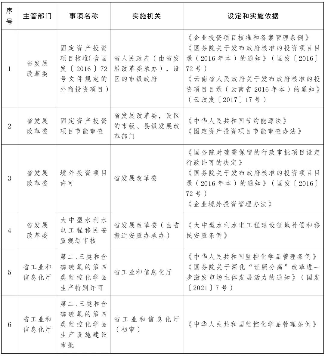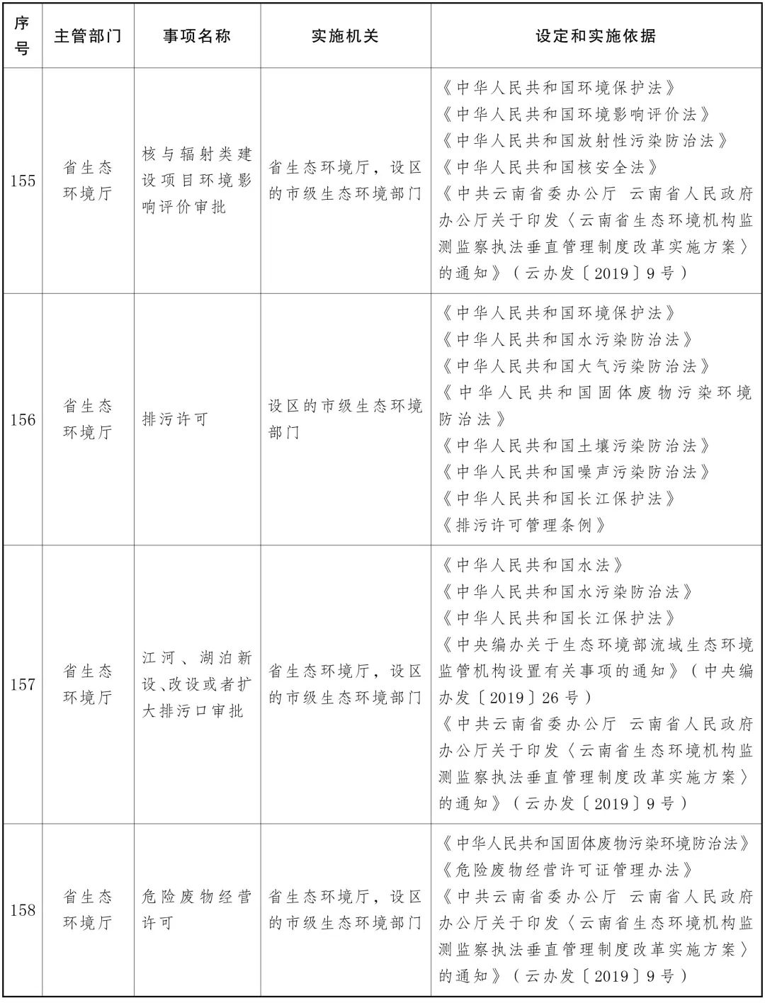一、新增实施许可事项。新增“非银行支付机构许可”许可事项,主管部门为中国人民银行云南省分行;新增“古树名木移植审批”许可事项,主管部门为省林草局。