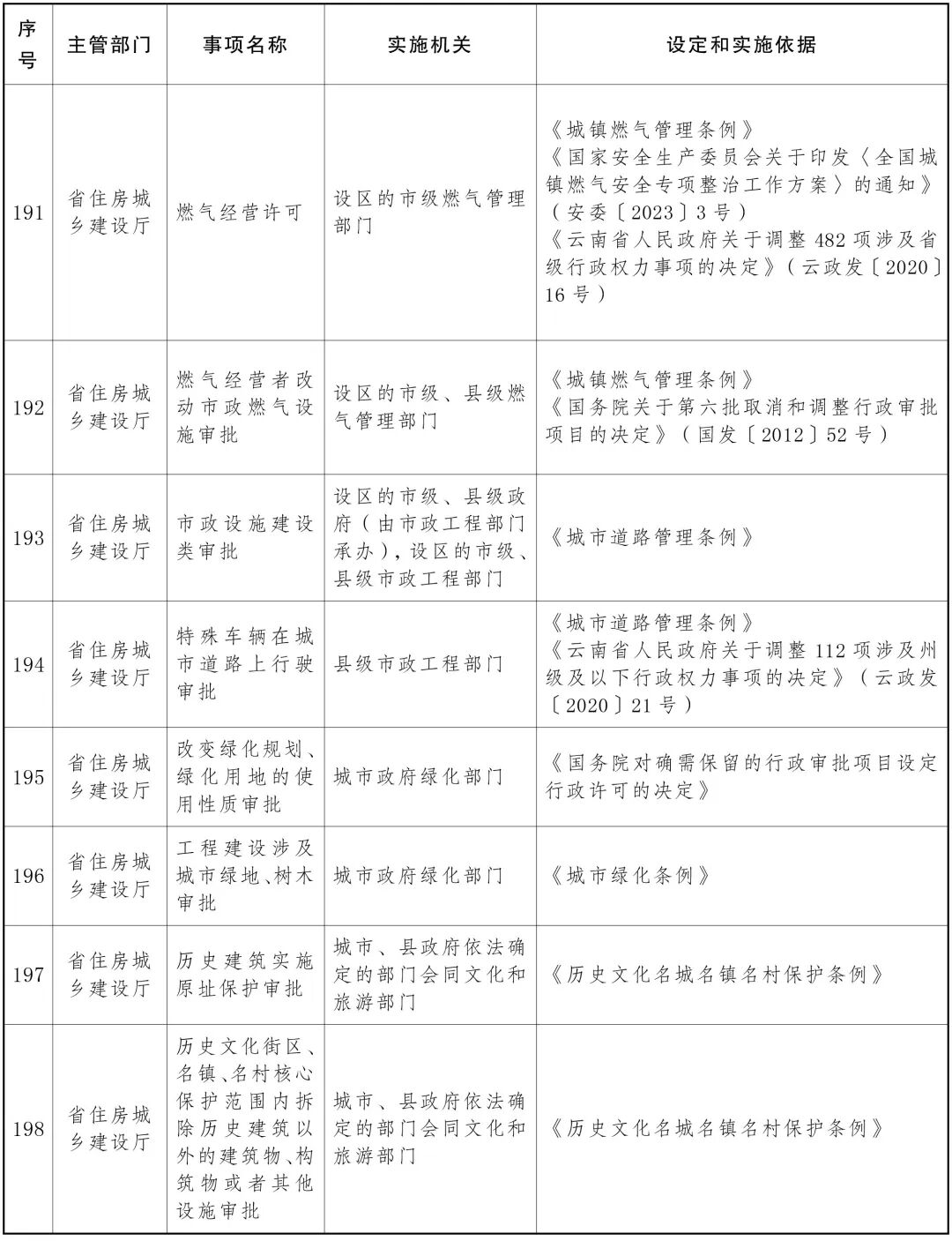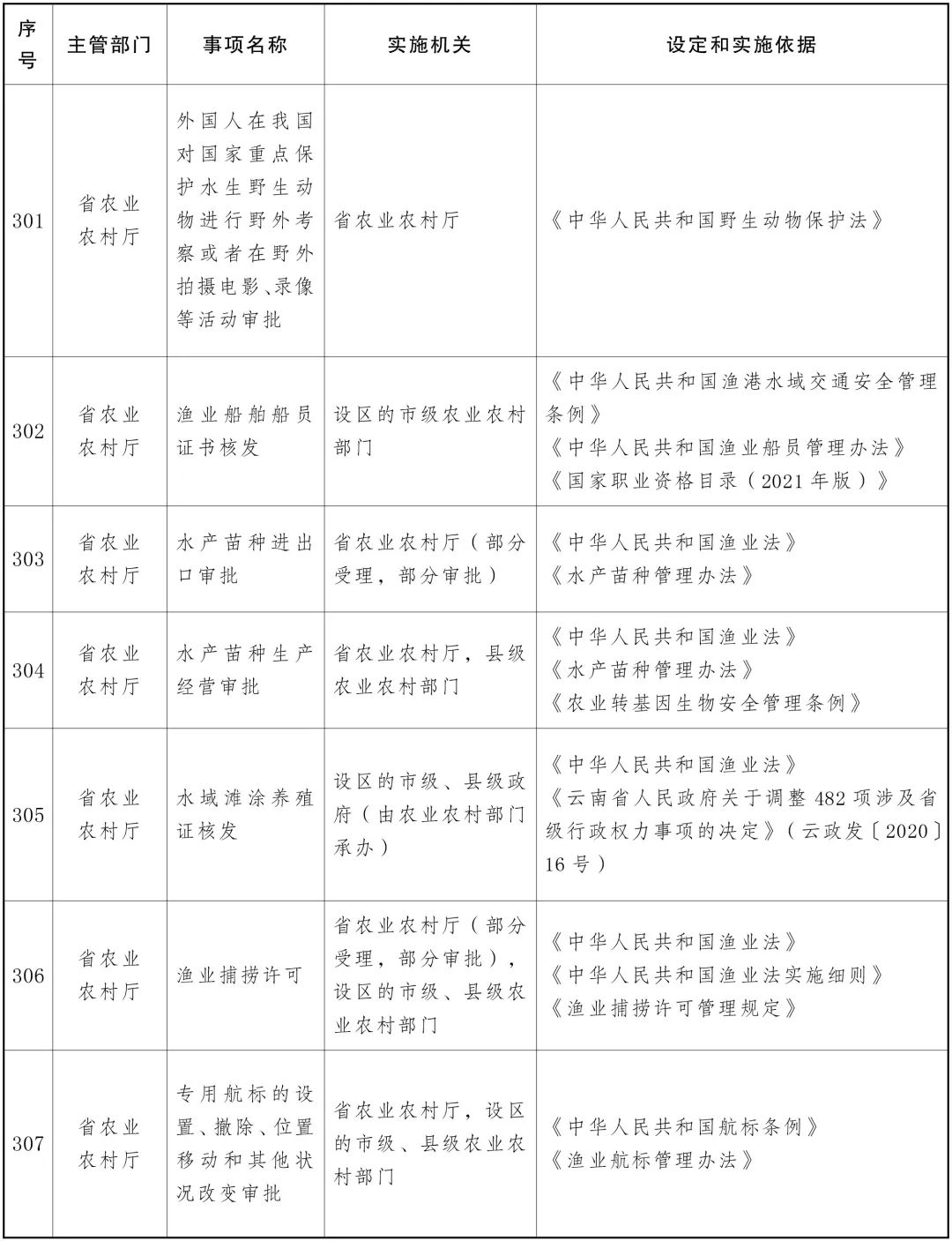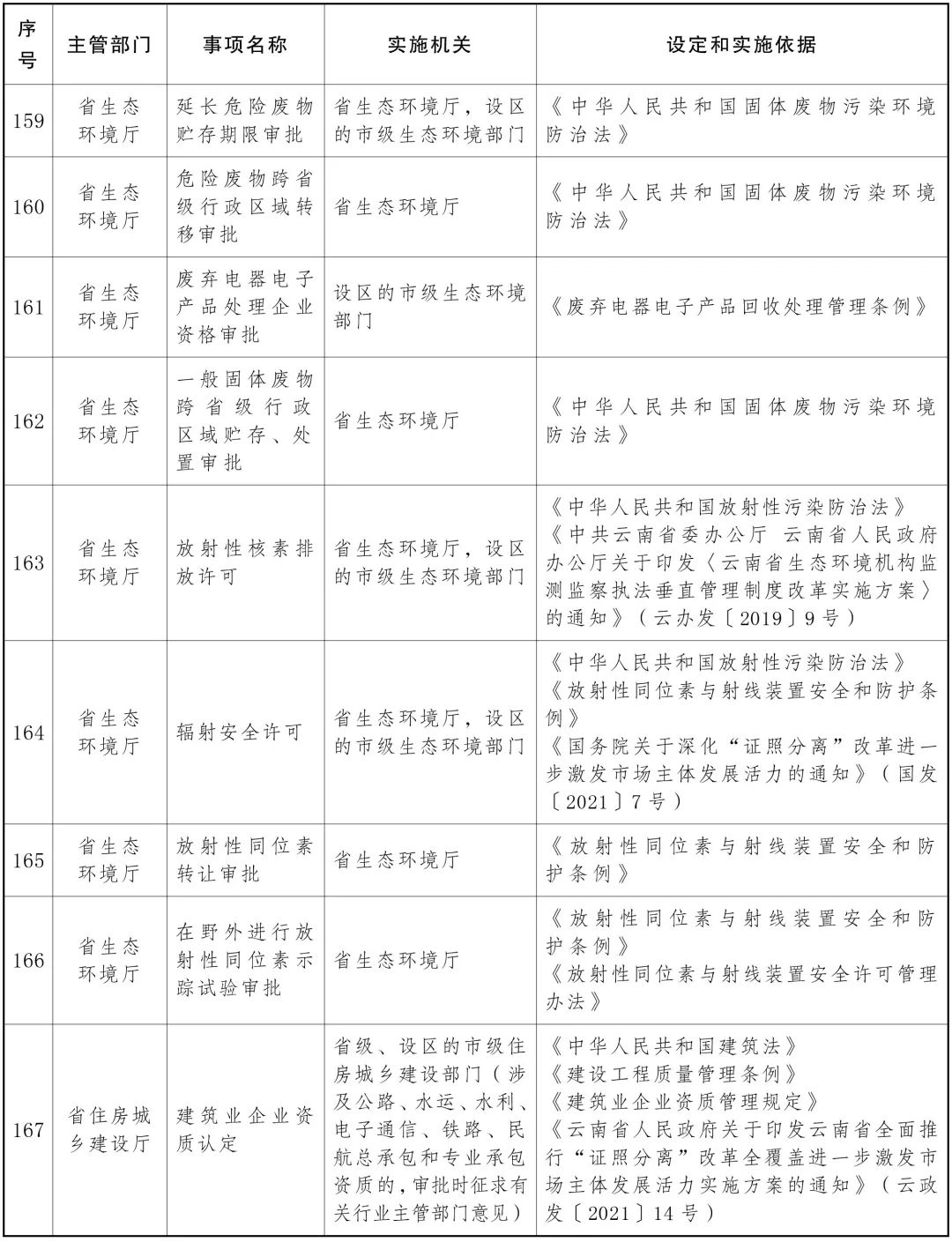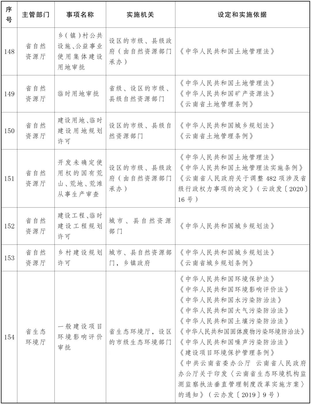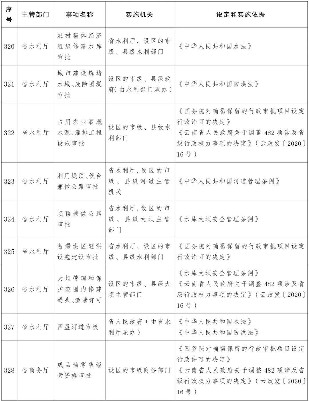 一、新增实施许可事项。新增“非银行支付机构许可”许可事项,主管部门为中国人民银行云南省分行;新增“古树名木移植审批”许可事项,主管部门为省林草局。