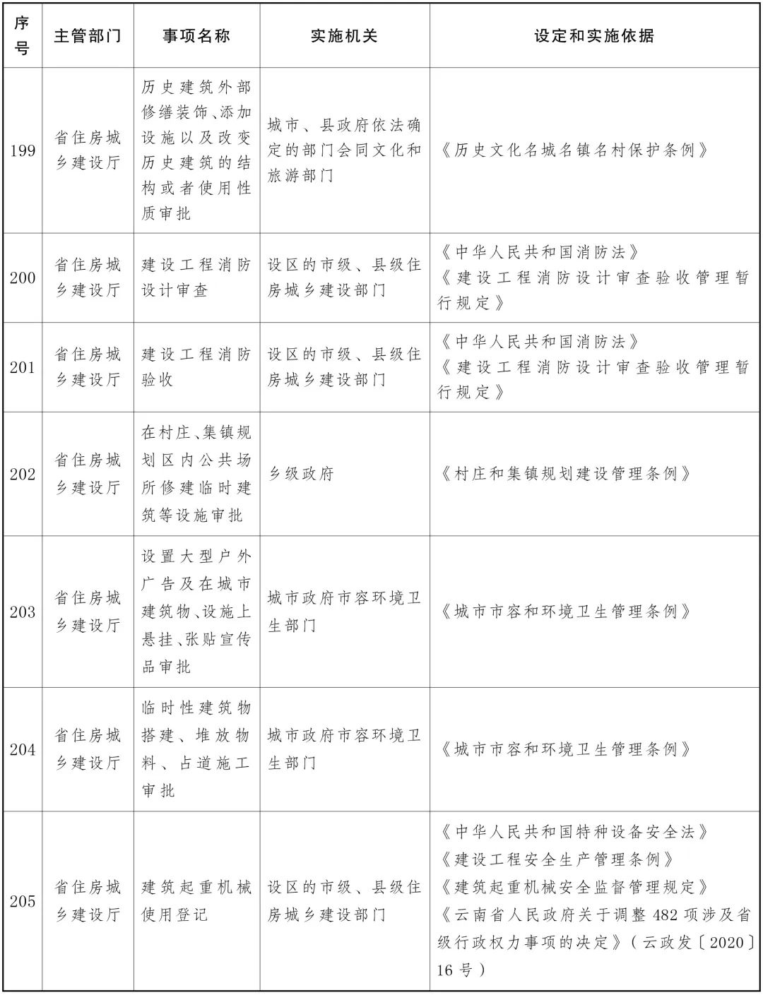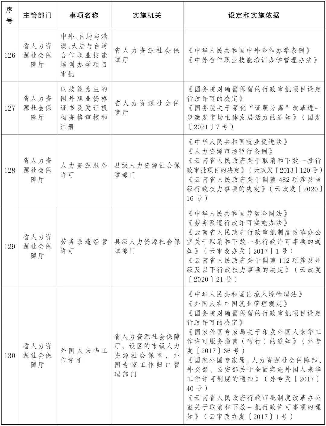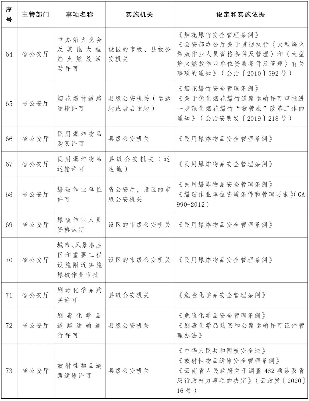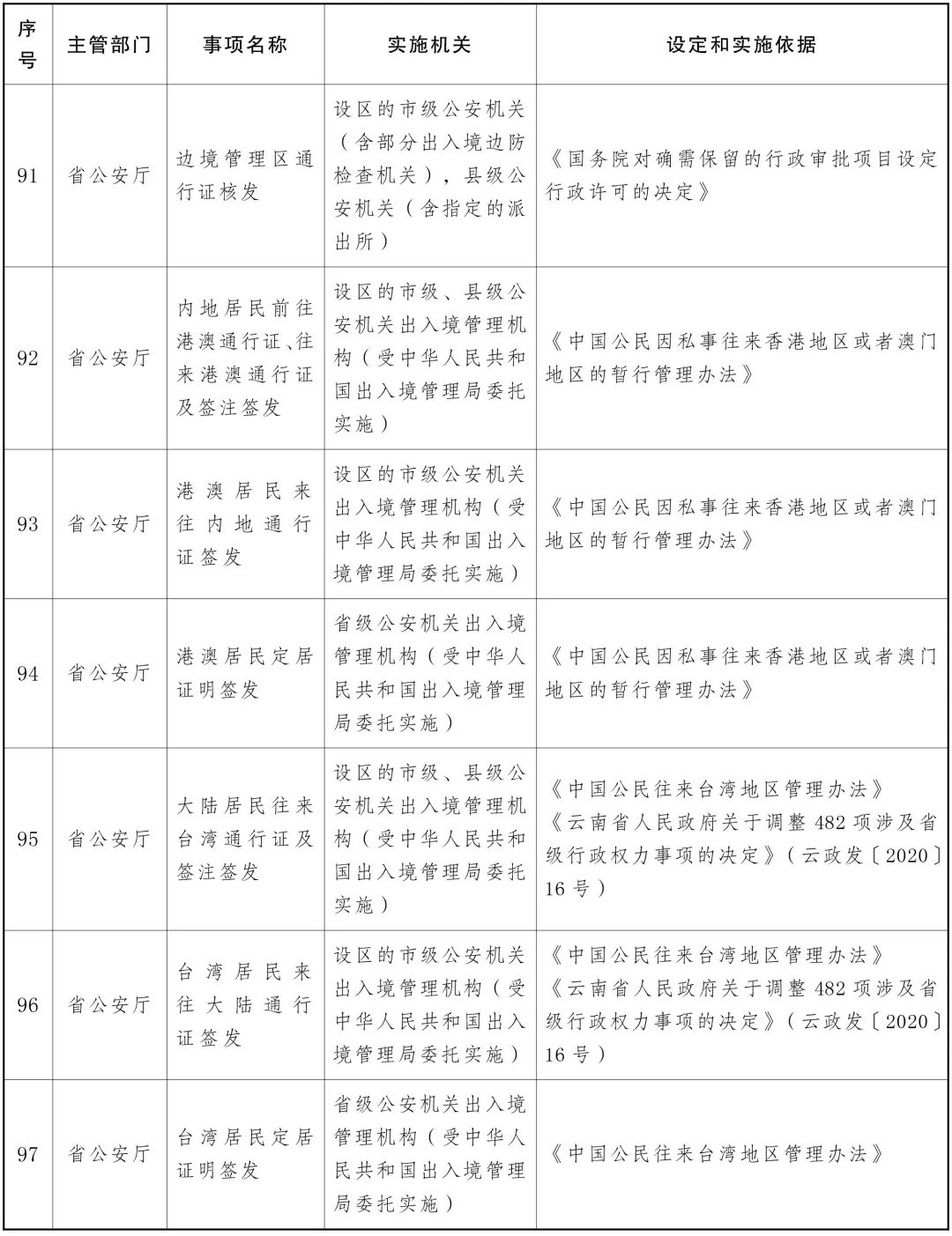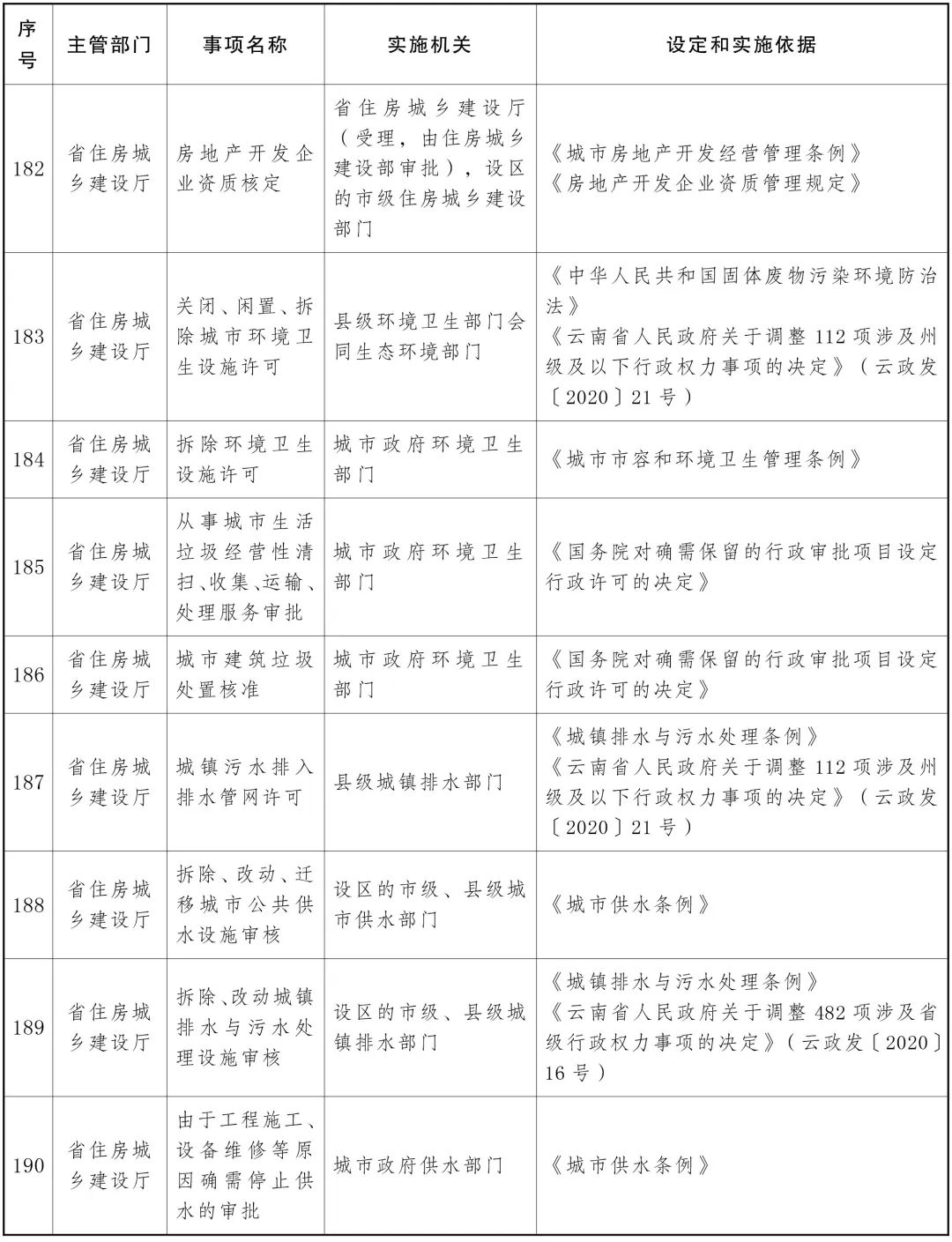一、新增实施许可事项。新增“非银行支付机构许可”许可事项,主管部门为中国人民银行云南省分行;新增“古树名木移植审批”许可事项,主管部门为省林草局。