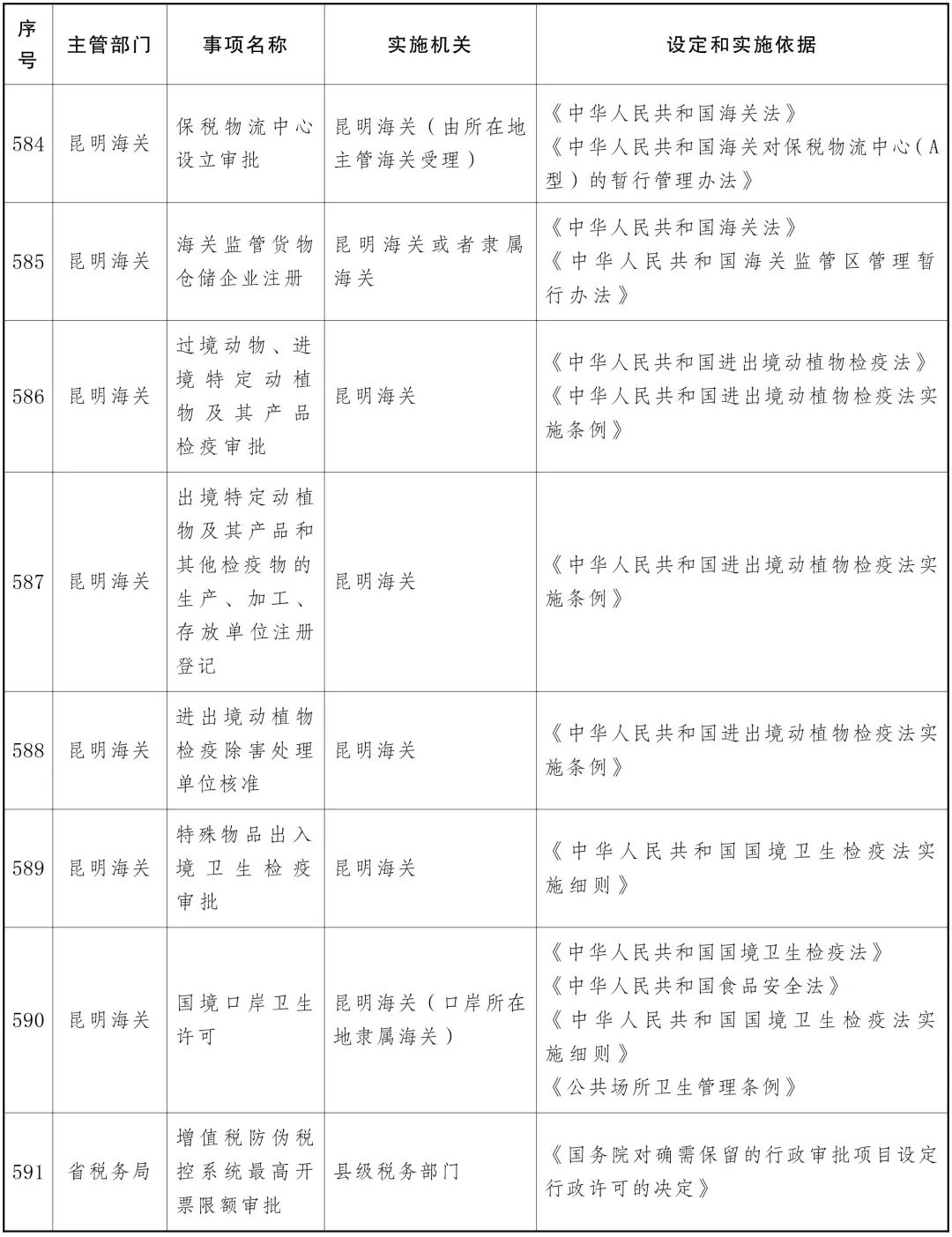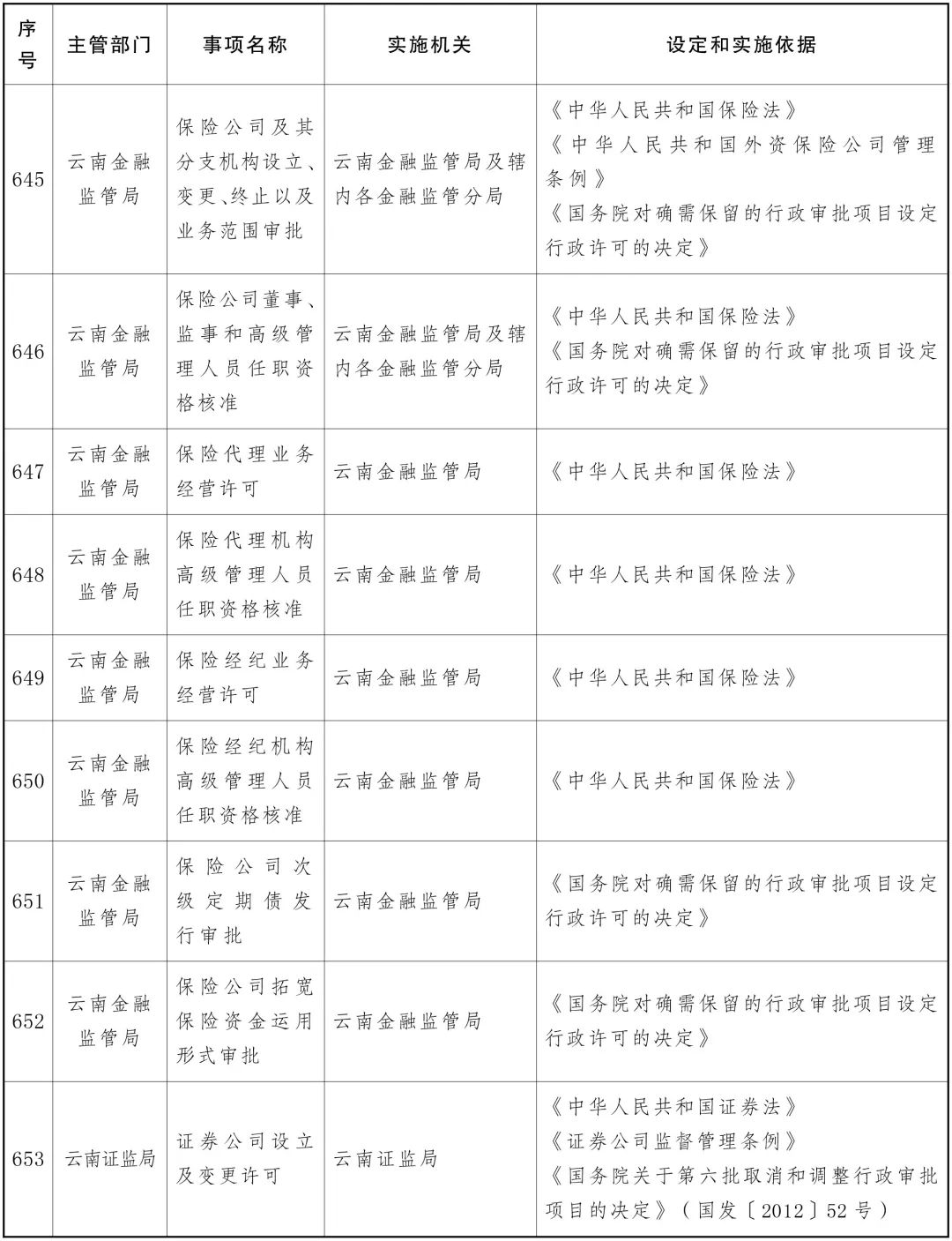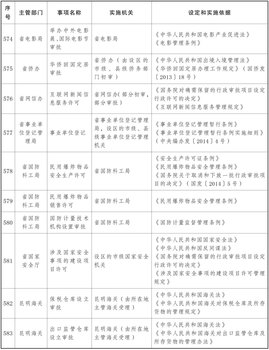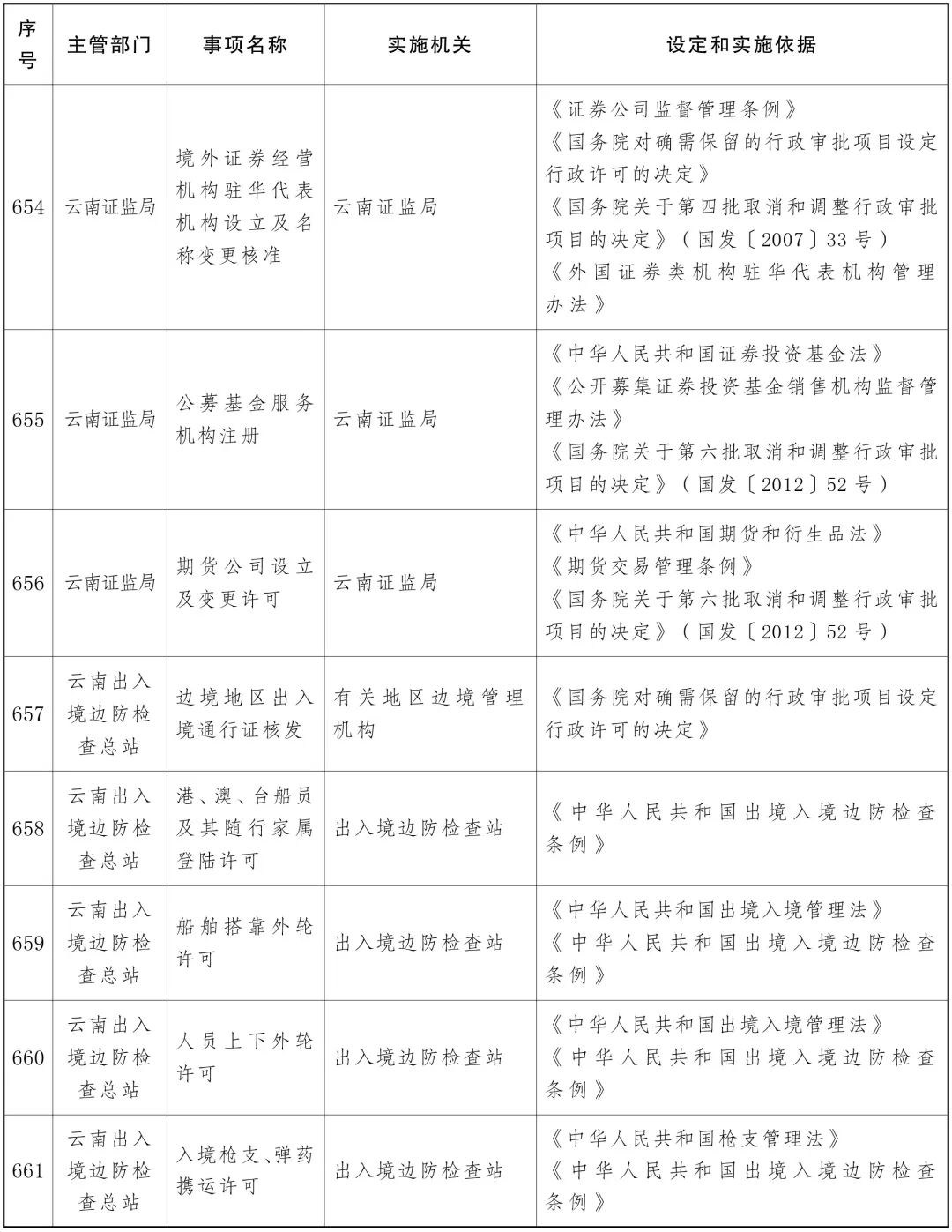 一、承接法律、行政法规、国务院决定设定的在云南省实施的行政许可事项(共664项)