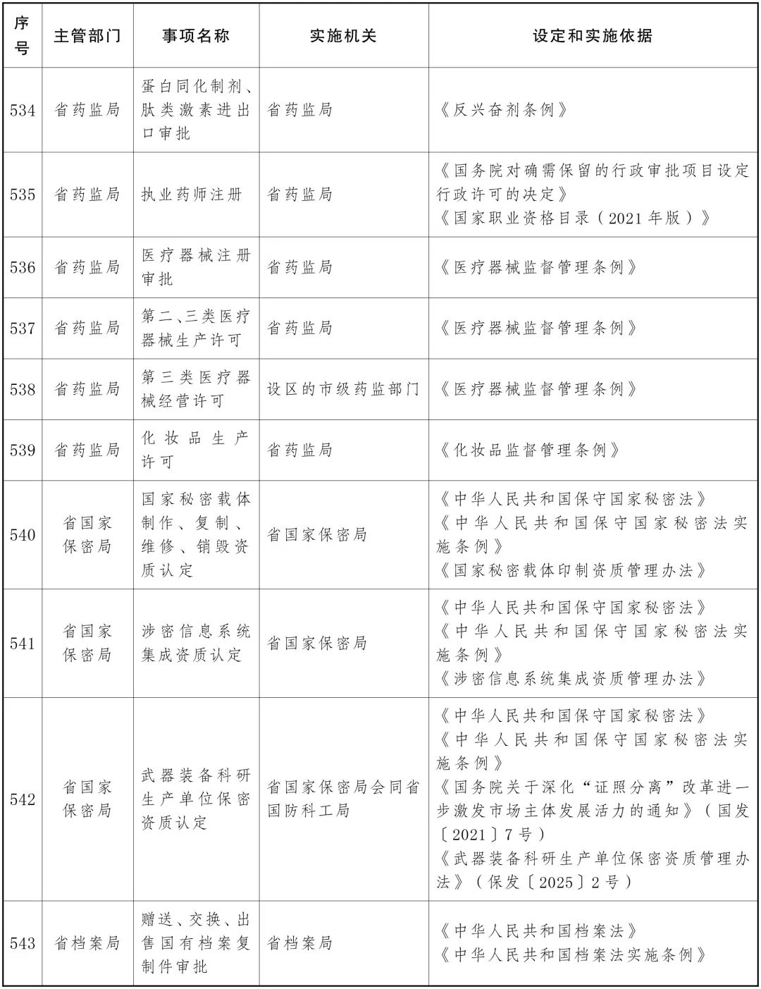 二、取消实施许可事项。取消“药品批发企业筹建审批”、“药品零售企业筹建审批”、“药品、医疗器械互联网信息服务审批”、“矿山闭坑地质报告审批”、“公章刻制业特种行业许可”、“互联网上网服务营业场所信息网络安全审核”许可事项。中央层面清单将“医疗机构人体器官移植诊疗科目登记”许可事项的实施层级调整为国家卫生健康委,不再列入本清单。
