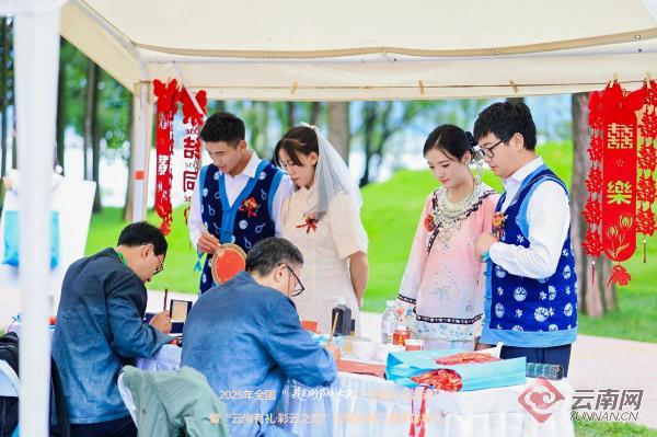新人们或着本民族服饰或中式礼服,依次完成“走鹊桥”“撒五谷”等传统婚礼环节,既满含传统韵味,又不失现代浪漫。“依托‘全国通办’政策,我们在云南实现了‘旅行结婚+集体婚礼’的心愿,穿白族婚服走鹊桥特别有仪式感,既低碳经济,又能和其他新人共享幸福,未来我们也会带动身边人选择文明婚俗。”参加集体婚礼的省外新人代表开心地说道。来自大理的本地新人代表则提到:“微风细雨抵挡不住爱的温度,暖心的白族‘三道茶’,热情的撒喜糖,无不让我们感受到主办方的深深关怀。”来自曲靖市的新人代表表示:“赶喜街、非遗甲马、心理避风港、同心圆梦屋、婚姻辅导站等互动环节,既有趣又温馨,让我们对彼此有了更独特的感受,助力我们未来经营好自己的幸福小家。”