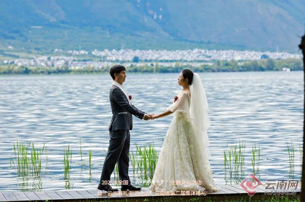 大理州主会场、大理市喜洲镇海舌蜜月半岛格外亮眼,其中27对来自省外的新人成为现场焦点。他们依托婚姻登记“全国通办”政策,在云南顺利完成结婚登记,更以“旅行结婚”的方式身着大理白族、彝族等绚丽云南民族婚服参与仪式,在苍山洱海的映衬下,定格跨地域的浪漫。