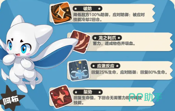当然,也要搭配一些可以应对防御、有回复的精灵,这样可以在敌人瞄准己方某个单位的时候保下该角色,阿布本身的技能组一般是选择高风险高收益的,如果被对手先手了自身没有足够的生存手段很容易撑不到第二回合。