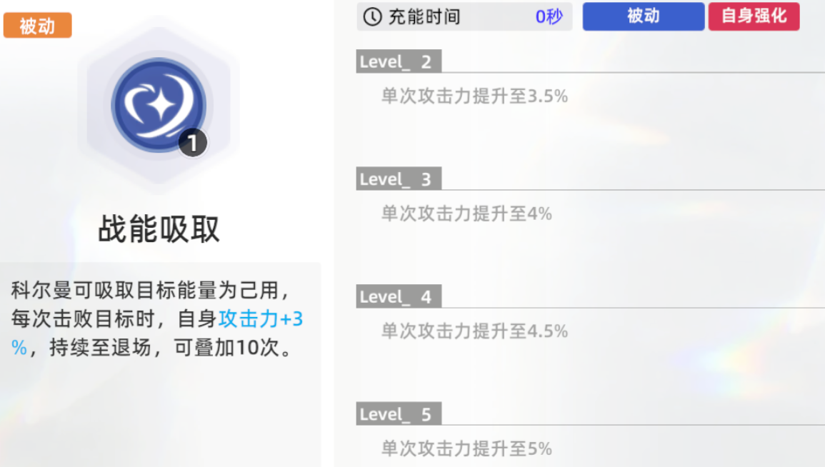 被动是每次击败目标可以提升自己最高5%的攻击力,持续至退场,最多能叠10次,也就是最大50%的攻击力加成,这个加成比例是很恐怖的。这也使得她在长线兵潮类型的战斗中有出色表现。