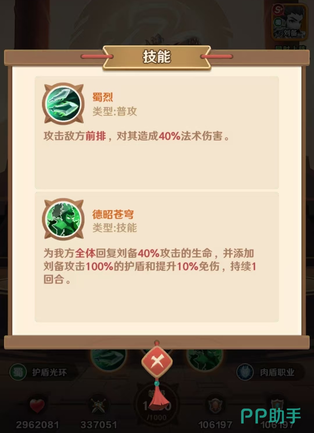 首先了解一下刘备的技能和天赋特点,他的技能可以给我方全体恢复生命值,并添加护盾和免伤。无论是治疗还是护盾,都是按照刘备的攻击力百分比附加。天赋效果在达到九星时可以激活额外的增伤和免伤属性,达到名将一星时效果是护盾被击碎可以恢复血量,护盾自然消失,会将剩余护盾转化成血量。在达到名将三星时,如果护盾被击碎,则立即对攻击者释放一次普通攻击。达到神将一星时,友方任意目标生命值首次低于30%,都可以立即给其附加一个护盾,在护盾存在期间受到的治疗额外提升。