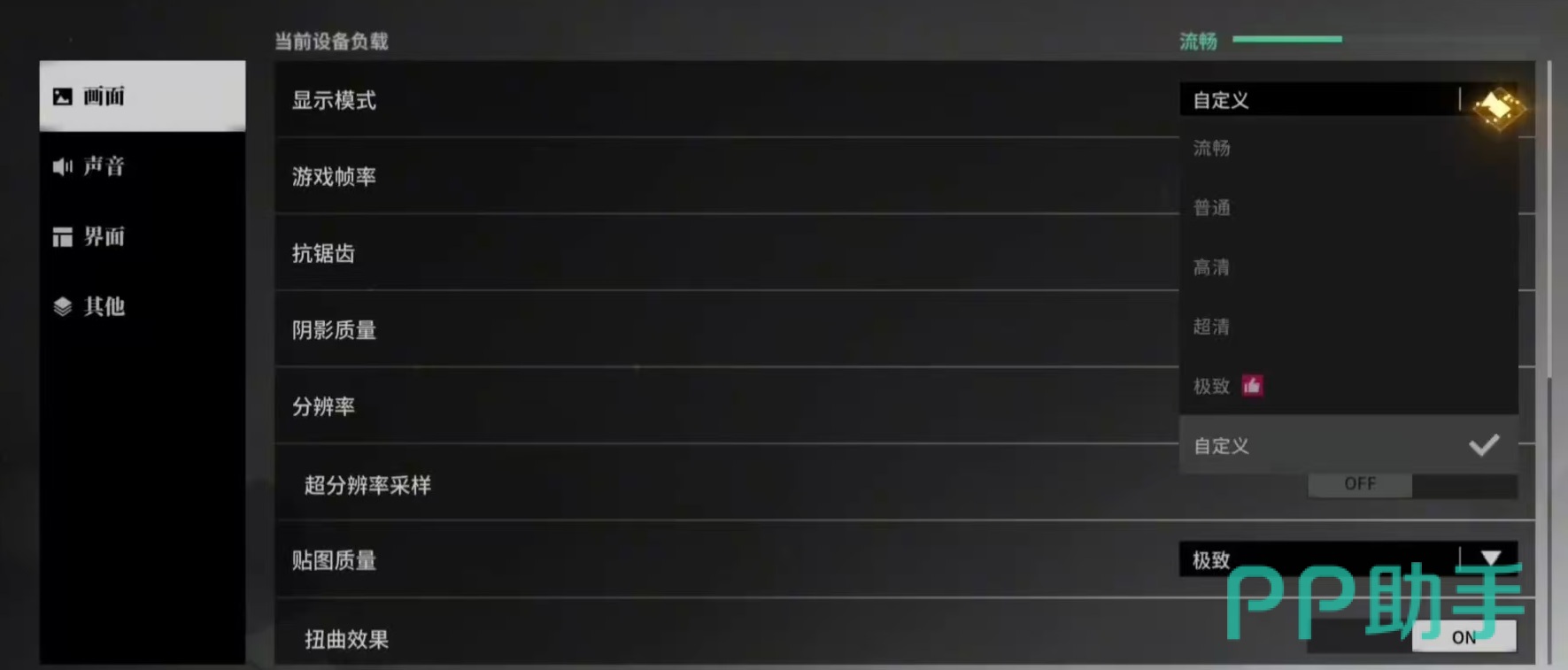 主要选项包括显示模式、游戏帧率、抗锯齿、阴影质量、分辨率、贴图质量等。显示模式比较推荐自定义,这样自由度高。帧率方面手机最高达到60帧,如果硬件足够,就优先锁60帧,保持手感不足就锁30帧。辨率方面尽量拉满,这是画质的基础。超分辨率可以选择,低配置可开提清晰度,高配置可以关闭。抗锯齿方面有两个选项,TAA更加稳定,FXAA则更省性能,大家根据自己的硬件去决定。