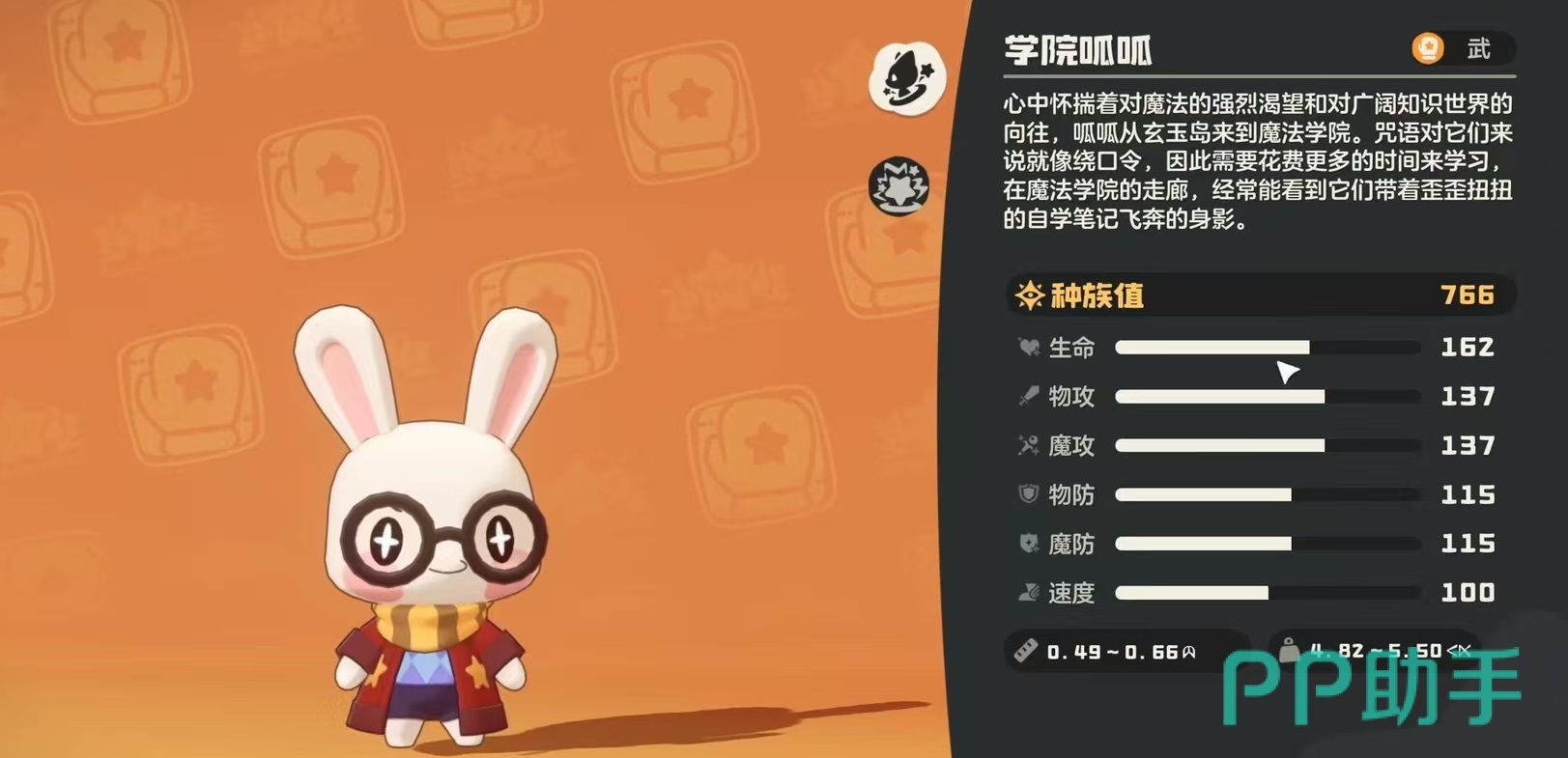 在外观方面,学院呱呱是一个兔子的形象,拥有长长的耳朵,它是以留学生的身份在魔法学院中学习,经常拿着写满错别字和涂改痕迹的咒语笔记到处奔走,诵念咒语时屡屡卡壳。虽然外形比较萌,但是在特性方面却很独特,在属性方面种族值达到了766,其中生命、物攻和魔攻这三项都很出色,物防、魔防和速度虽然稍逊一些,但依然属于在线的水准。因为速度比较低,所以可能跑不过一些极速的宠物。